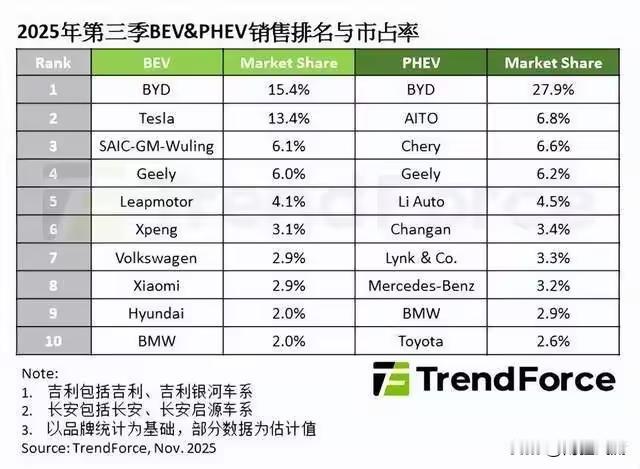 全球新能源市场格局生变?一组问答看懂中国品牌与特斯拉的博弈 问:全球新能源汽车“王者”之争,市值与销量为何分化? 答:资本市场上,特斯拉以超1.5万亿美元市值稳居全球车企榜首;但终端销量中,中国品牌已全面反超。2025年1-10月中国新能源车占全球市场份额68%,10月冲高至75%,彻底改写产业格局。 问:最新全球销量排名有哪些关键变化? 答:CleanTechnica 2025年10月数据显示,比亚迪39.29万辆单月销量夺冠,吉利、五菱分列二三位,特斯拉7.58万辆排第四。2025年1-10月全球新能源销量1646.8万辆,比亚迪累计340万辆领跑,特斯拉129.2万辆同比下滑8.6%,前10名中国品牌占7席。 问:纯电和混动赛道竞争态势如何? 答:纯电领域,2025年三季度比亚迪以15.4%全球份额夺冠,特斯拉13.4%居次,全球前10纯电车企中国占6席;混动赛道前五名全为中国品牌,比亚迪以27.9%份额领跑,外资品牌难以抗衡。 问:中国品牌全球领跑的核心优势是什么? 答:关键在于全产业链实力与技术突破。从刀片电池到DM-i混动技术,中国车企攻克核心技术;1-10月出口份额升至13.8%,超120万根超充桩与完善供应链,形成难以复制的竞争壁垒。