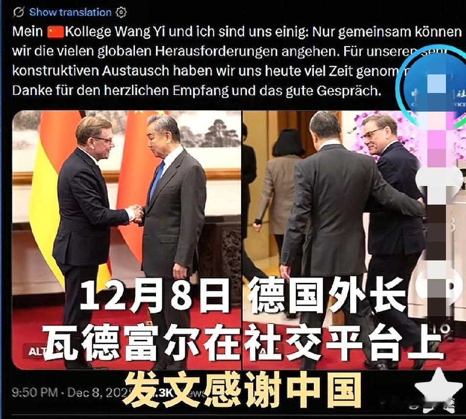 德国外长来华访问,不虚此行。他在社交平台上发文感谢中国。 真的,他来访问是一波三折。估计也就是这样的,好事多磨,中德联手能为这个时代的挑战加强合作也算是一个回报。 德国这个欧洲实力最强的老牌大国,从俄乌冲突就站错队了。后来厮跟着美国和我们搞摩擦,都是错错错。都是嘴上的战略政治家,像小孩子一样的想问题。和俄罗斯闹掰了,能源是大麻烦,一切都受影响。和中国合作不顺畅,经济倒退。 眼下只好一点点地走出来,接近中国,重启一下吧。因为他看到了中美贸易谈判的画面,睡不好觉。自己把自己卖了,还帮美国一起数钱。到头来吃亏的都是自己。 别哭了,估计这哥们破涕为笑。