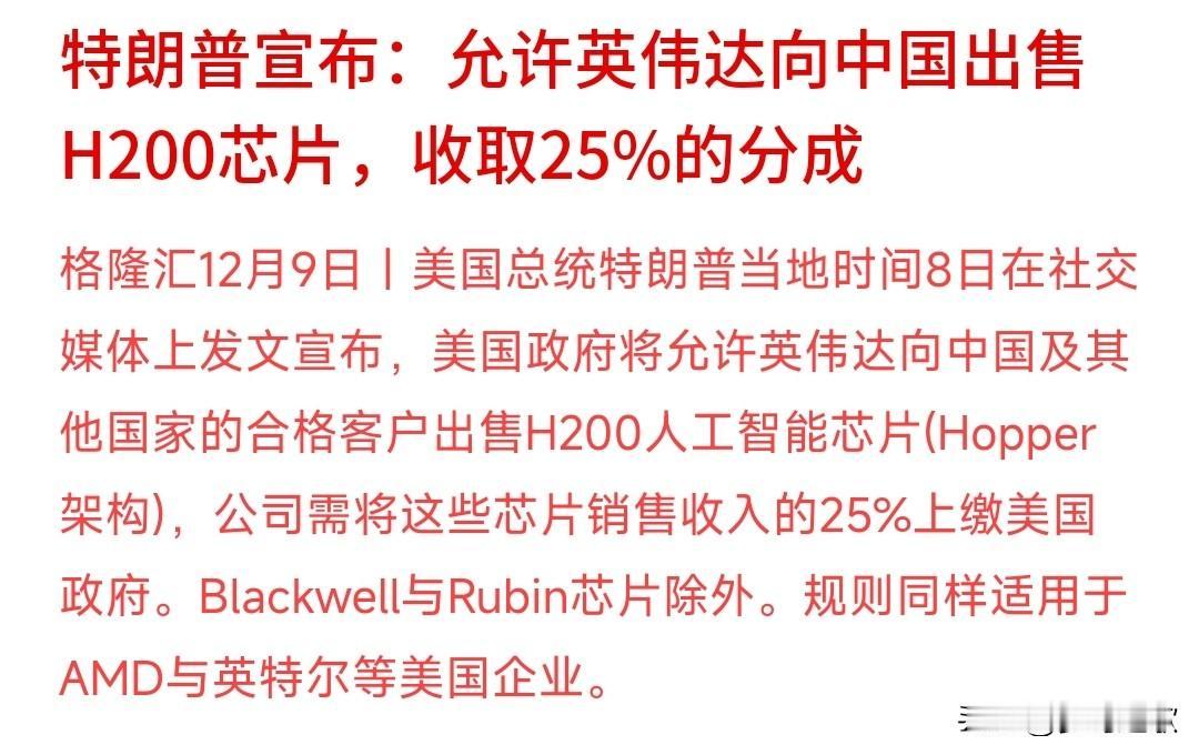 特朗普还是松口了,对华销售英伟达H200开始恢复,但英伟达犯难了 今天特朗普宣布恢复对华供应英伟达H200。但是对华销售的收入的25%要交给美国。也就是说H200恢复但可能因为特朗普收取的25%的分成可能会涨价。 对于中国来说这是美国对华限制芯片的阶段性胜利,原来本来是要对华销售阉割版H20的,只不过中国不要。英伟达对华销售额一度降为零,为了挽救中国市场特朗普还是做出了妥协。 但如果H200涨价,还是会进一步压缩中国的市场,昇腾芯片会进一步压缩英伟达H200的生存空间。 如果不涨价那就是白白把利润分给了美国政府25%,就看英伟达怎么选择了。