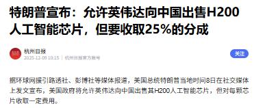 美国对华出现重大让步,中美已经走向事实上的互利共赢之路! 12月9日,根据法新社报道,美国总统特朗普亲口宣布,美国将允许英伟达AI芯片出口中国。法媒称,美国商务部即将批准英伟达(Nvidia)高端 H200 人工智能芯片出口至中国。很显然,特朗普的这一宣布,这意味着美国在技术管制方面出现了重大松动。 H200芯片是英伟达的高端产品,它在数据运算速度上比H100更快,综合性能甚至是此前允许对华出口的H20的六倍,这意味着中国在AI算力上的短板将得到明显改善。 对于国内的人工智能实验室来说,这一次如果能用上H200,就能打造接近美国顶级AI超级计算机的系统,在算力决定竞争力的背景下,这无疑为中国加速人工智能应用落地提供了坚实支撑。 美国这一决定并不是随意为之,而是在一轮轮博弈之后的现实选择,过去几年,美国在技术出口上对中国严加限制,试图通过“卡脖子”来拖慢中国科技发展。 但中国并没有被动接受,而是利用稀土管制等策略进行反制。稀土是全球高科技制造必需的资源,美国企业同样依赖,这让华盛顿切身感受到制衡的压力。 这背后还有经济层面的驱动力。英伟达作为美国科技巨头,长期依赖中国市场,一旦失去这样一个庞大的消费群体,不仅营收会受到严重影响,还可能刺激中国加快自研产品的节奏,削弱美国的市场优势。 对于美国政府来说,放行芯片既能保证企业利润,又能增加税收,这在经济不稳定时期尤其重要。 对中国而言,这次松绑是硬实力和有效反制换来的结果,我们不仅获得了全球顶尖的硬件支持,还在中美关系中稳住了经贸合作的基本盘。从长远看,中美互补关系明显,美国有技术和产品,中国有市场和资源,如果继续对抗,只会两败俱伤。 这次的H200出口,是美国对华政策中一次重量级的信号,它代表了从极端封锁向有限合作的转变,也说明中美在科技和贸易上有可能找到新的平衡点。未来双方或许依然会在尖端领域竞争,但更多的合作将减少不确定性,让全球产业链趋于稳定。 这盘棋已经开始,主动权不再完全在美国手里。中国用实力换来了话语权,也用反制让对方正视我们的价值。接下来,中美能否在更多领域打开合作之门,将决定全球科技格局的走向。 你觉得,美国这次解禁是长远战略变化,还是暂时的退让?欢迎分享你的看法。