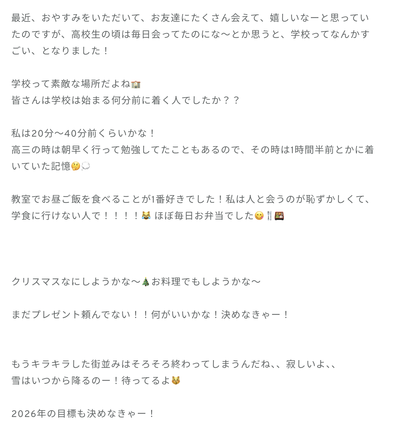 片山紗希「先日、お友達と海の夢の国に行きました🐭🏰夕方から入場したのですが、いつも以上に混んでいて、クリスマスディズニーの魅力は無限大だな〜と思いました!老若男女に好かれるディズニー。私もディズニーになりたいなと思いました😆ちなみに、乗った乗り物は5分待ちだったシンドバッドです🙄楽しかった☝🏻ご飯を食べたり、チュロスを食べたり、楽しかったです😽私は小学生の頃、毎年誕生日かクリスマスに家族とディズニーに行ってたんです!当日もこんなに混んでいたのかな〜??」