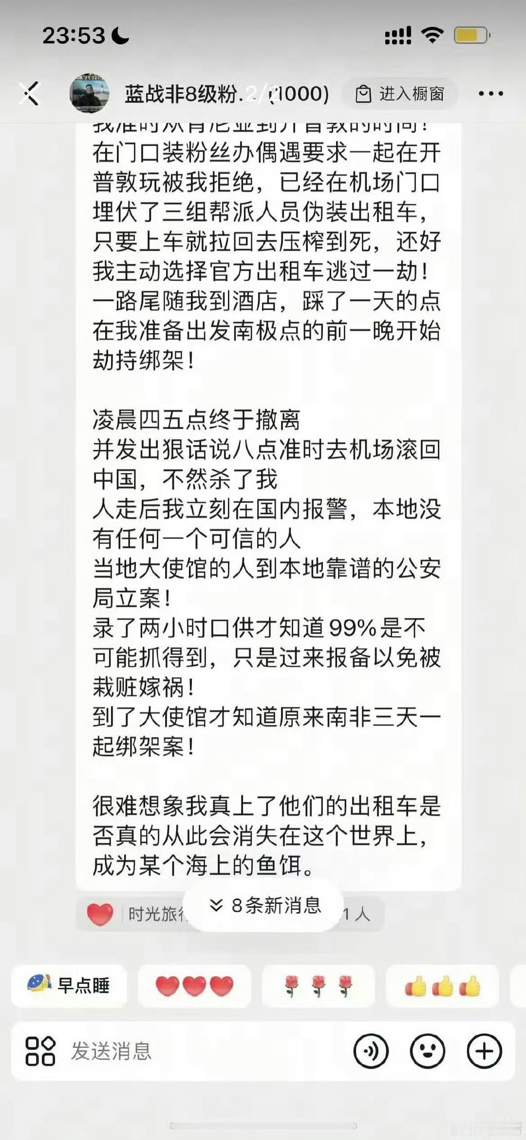 蓝战非公布自己在南非的被绑架的细节! 从目前来看,蓝战非这个被绑架几乎不可能破案,因为发生在海外这些参与的人也不会回到国内。 蓝战非这个事情也为其他在海外的中国人提了一个醒,需要时时刻刻注意自己的安全,其实对于公共人物来说还真的不好防护特别是一些网红,因为个人的信息都是可以买得到的。 大家是怎么看的?欢迎评论区留言。
