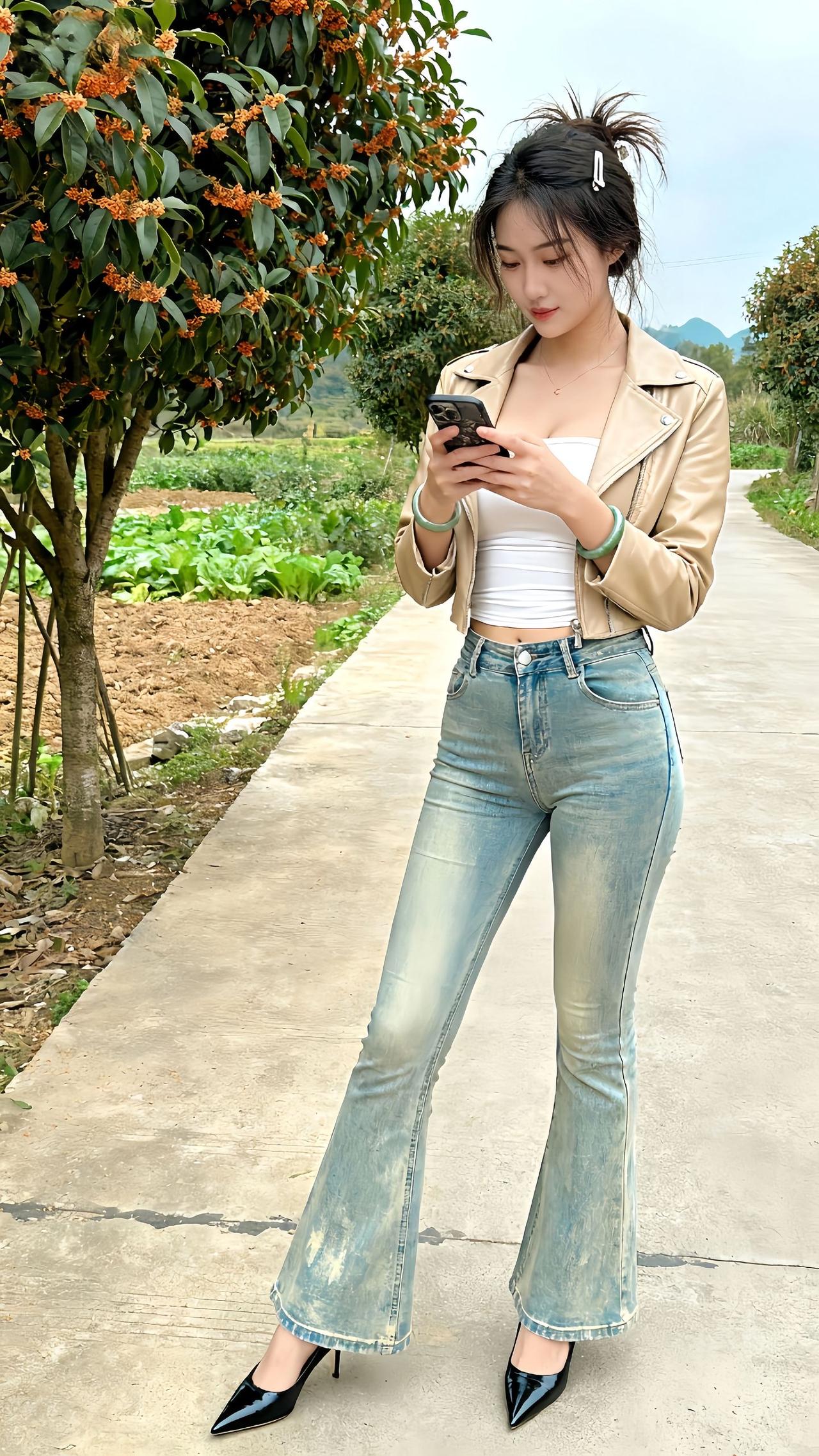 第10集穿搭分享 卡其短款皮夹克叠穿白色露腰吊带,皮面的飒中和吊带的柔,露腰设计掐出轻盈线条; 浅蓝做旧微喇牛仔,水洗纹理自带复古感,裤型顺着腿型坠出曲线,随性又勾人; 黑色漆皮高跟,冷艳质感和乡野场景撞出反差,拔高比例的同时更显精致。 桂花树下的乡野小路,甜飒穿搭和秋日桂香、田园绿意适配度拉满,是都市感揉进烟火气的松弛美~ 卡其皮夹克叠穿 做旧微喇牛仔 桂香辣妹风
