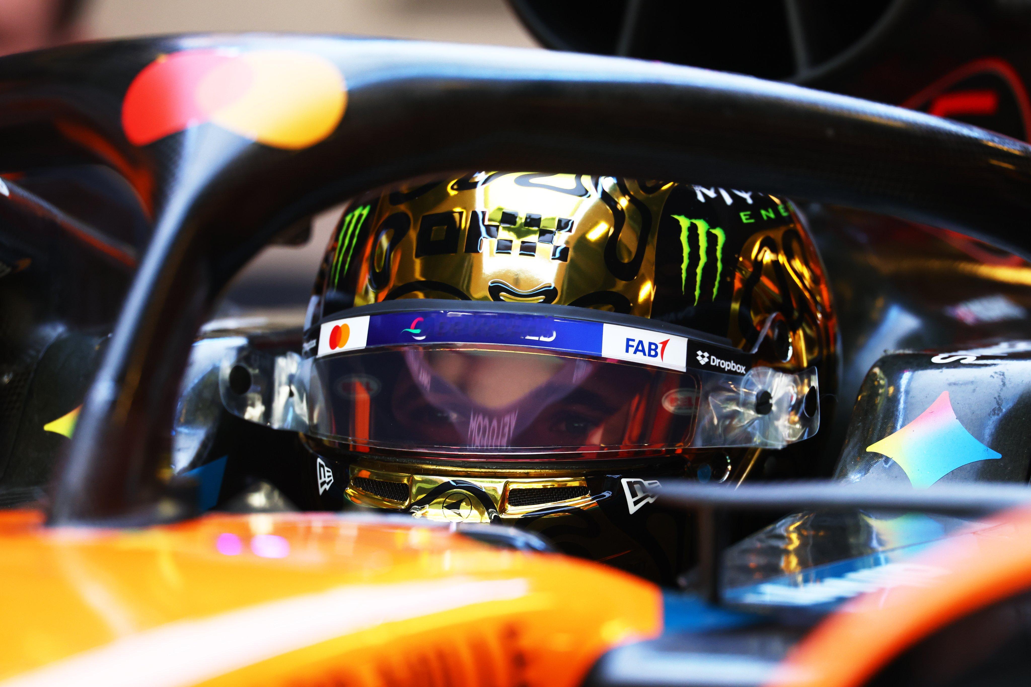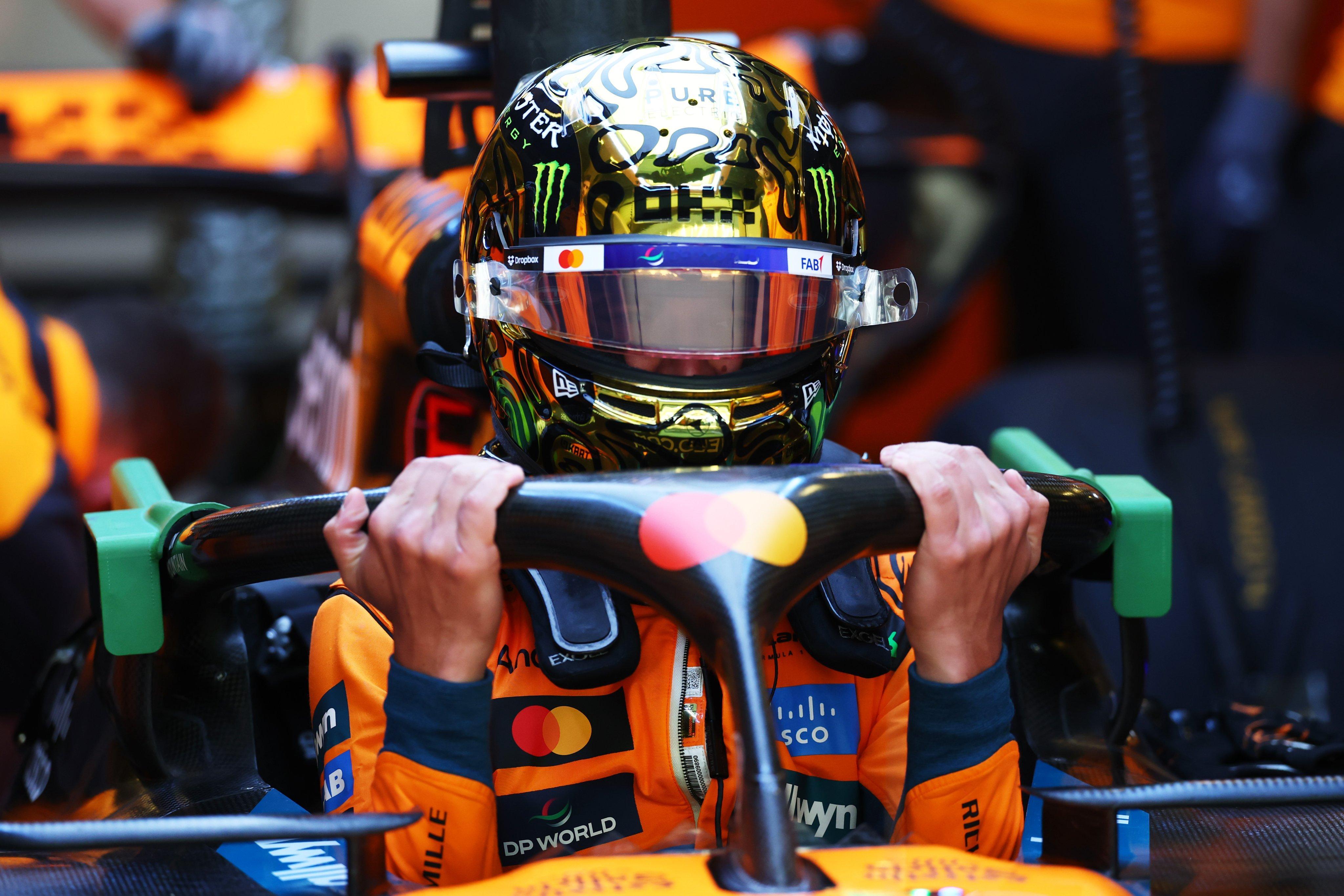 兰多·诺里斯佩戴他的世界冠军特别版金色头盔参加今天的阿布扎比季后测试✨F1