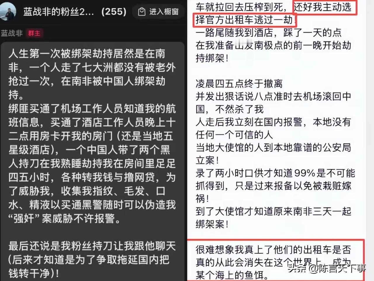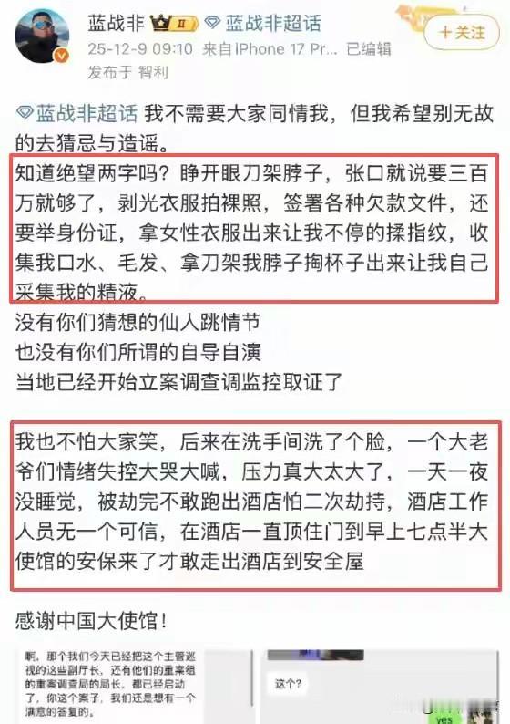 蓝战非被绑架一事,说到底还是他太高调了! 别人都说“出门在外,财不外露”,他倒好,孤身一人到处跑就不说了,还在直播和其他主播连麦也不收敛一点。 其实~以前我是不相信他会一个人旅游的,但这次他自曝被绑架后,我信了。 他这次也算是福大命大了,但要想把被劫的钱财要回来,恐怕很难了,且不说时间过去这么久了,就说他在海外被劫的,转账肯定也是海外账户,这笔钱要是没有授权,一般情况下都撤销不了交易,只能走走形式,先报警备案了。