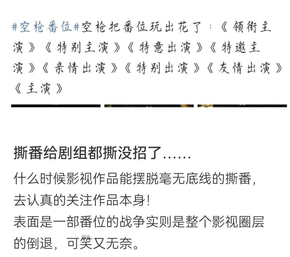 内娱title花式上新 《领衔主演》《特别主演》《特意出演》《特邀主演》《亲情出演》《特别出演》《友情出演》《主演》这是撕番给剧组都撕没招了吧……什么时候影视作品能摆脱毫无底线的撕番,去认真的关注作品本身!表面是一部番位的战争实则是整个影视圈层的倒退,可笑无奈又可悲。。。