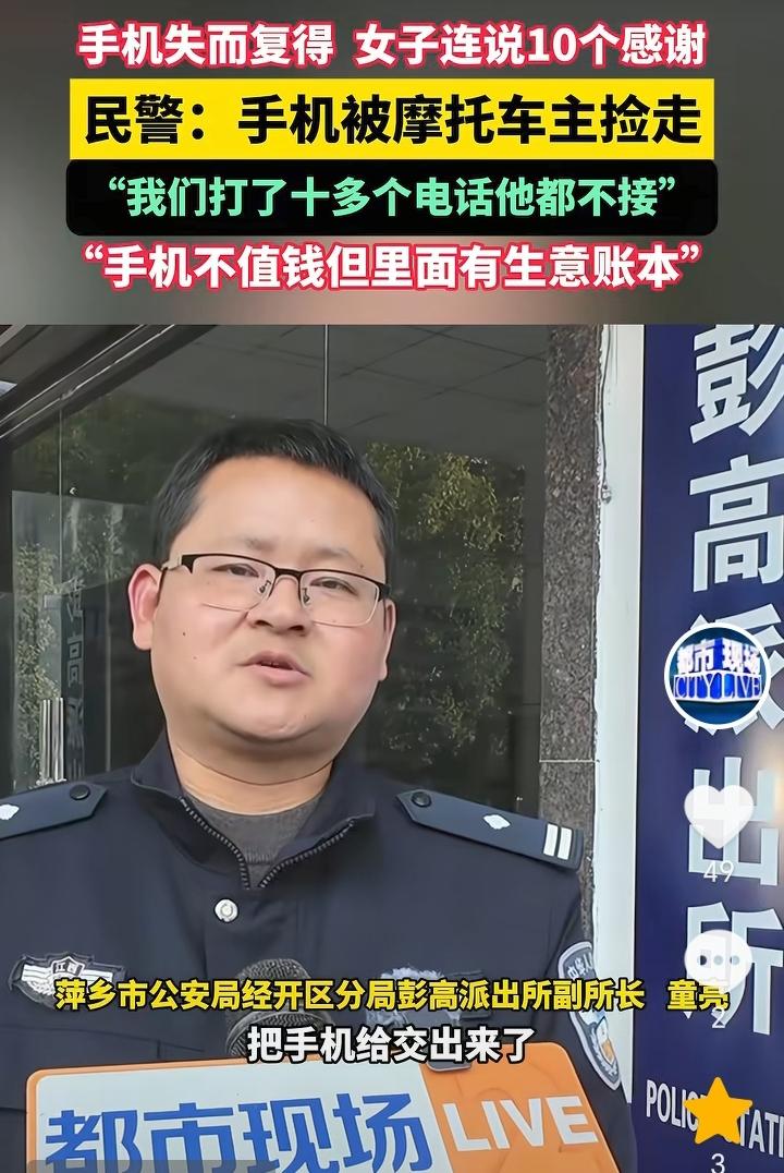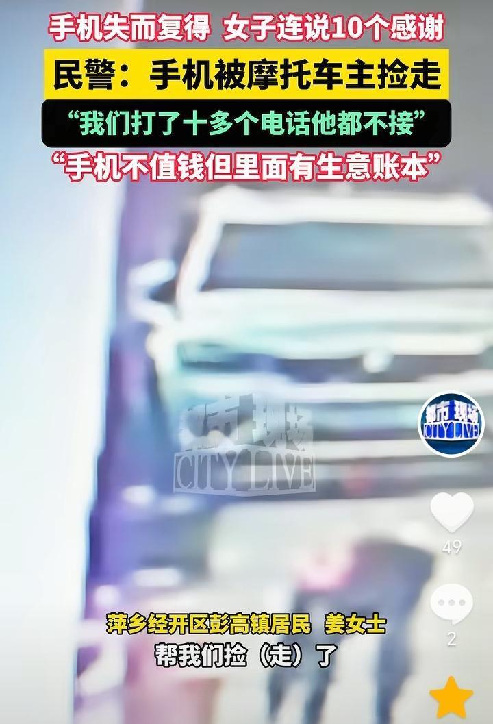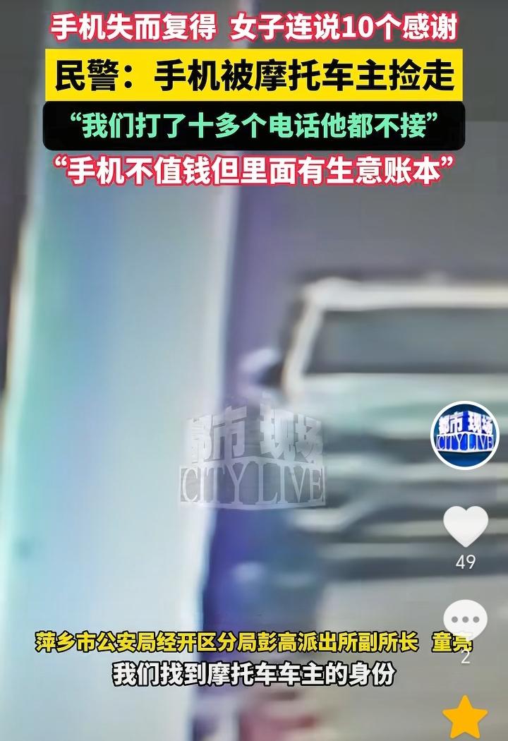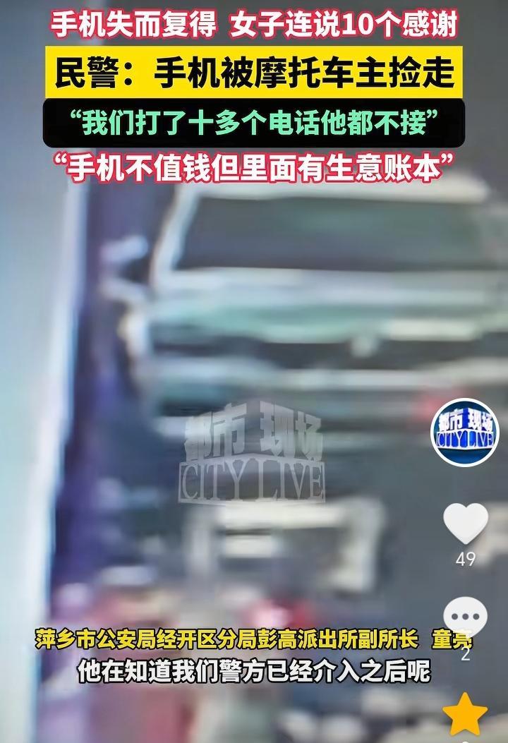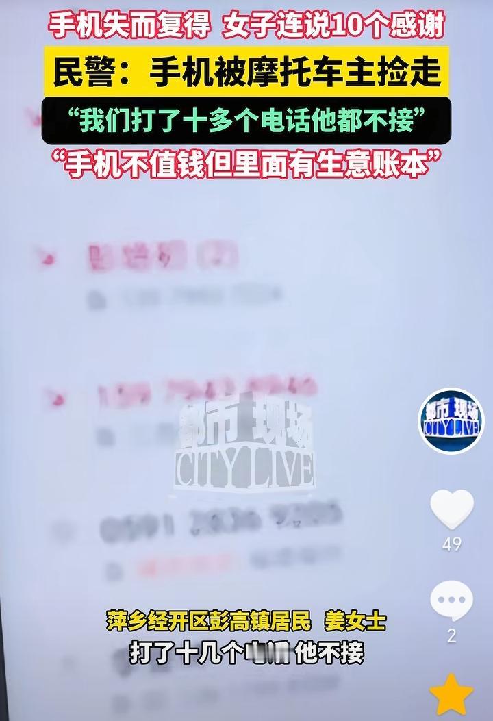 “被迫交还”!江西萍乡,女子手机不小心丢失,结果被一位摩托车主捡走,女子打了十几个电话捡走手机的人都不接,直到后来民警查询到了摩托车主身份,车主知道民警介入后就主动交还了手机,拿到手机那一刻女子特别激动,连续对民警说了10个谢谢。女子表示,这个手机还是比较重要的,因为生意账目都在手机里。 女子打了十几个电话摩托车主都不接,很明显他就没想着归还,他可能觉得自己捡手机没人发现,于是就抱着侥幸心理想要占为己有,殊不知他捡手机的举动被监控记录了下来,直到民警介入他才“被迫”主动交还。 生意账目最好还是记一个手工账,记在手机里并不保险,因为万一手机丢失那么账目也就没有了,如果找到手机还好,万一找不到那就损失大了。