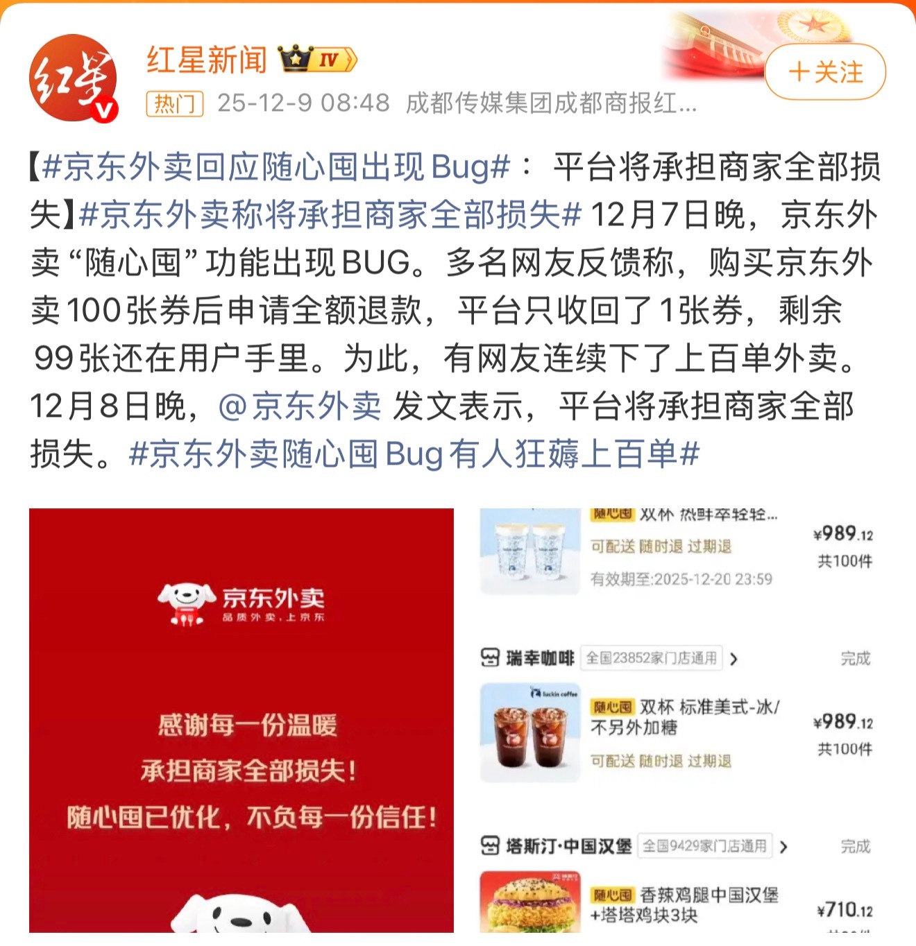 京东外卖回应随心囤出现bug昨天有个塔斯汀汉堡的员工说,我是塔斯汀员工 本来要下班了,结果来了一个订了几千单就付了几毛钱,直接吓了一跳。一查才发现平台出现了bug,但随后京东外卖就发文,将承担所有商家的全部损失,这一下格局就打开了,只是苦了当晚的员工。