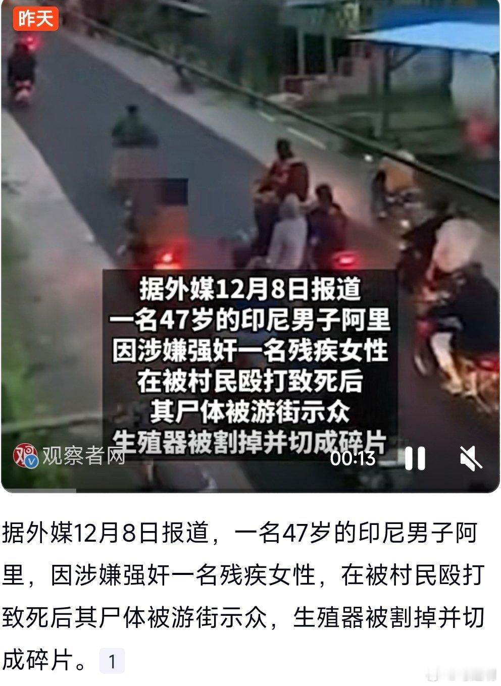 据外媒12月8日报道,一名47岁的印尼男子阿里,因涉嫌强奸一名残疾女性,在被村民殴打致死后其尸体被游街示众,生殖器被割掉并切成碎片。