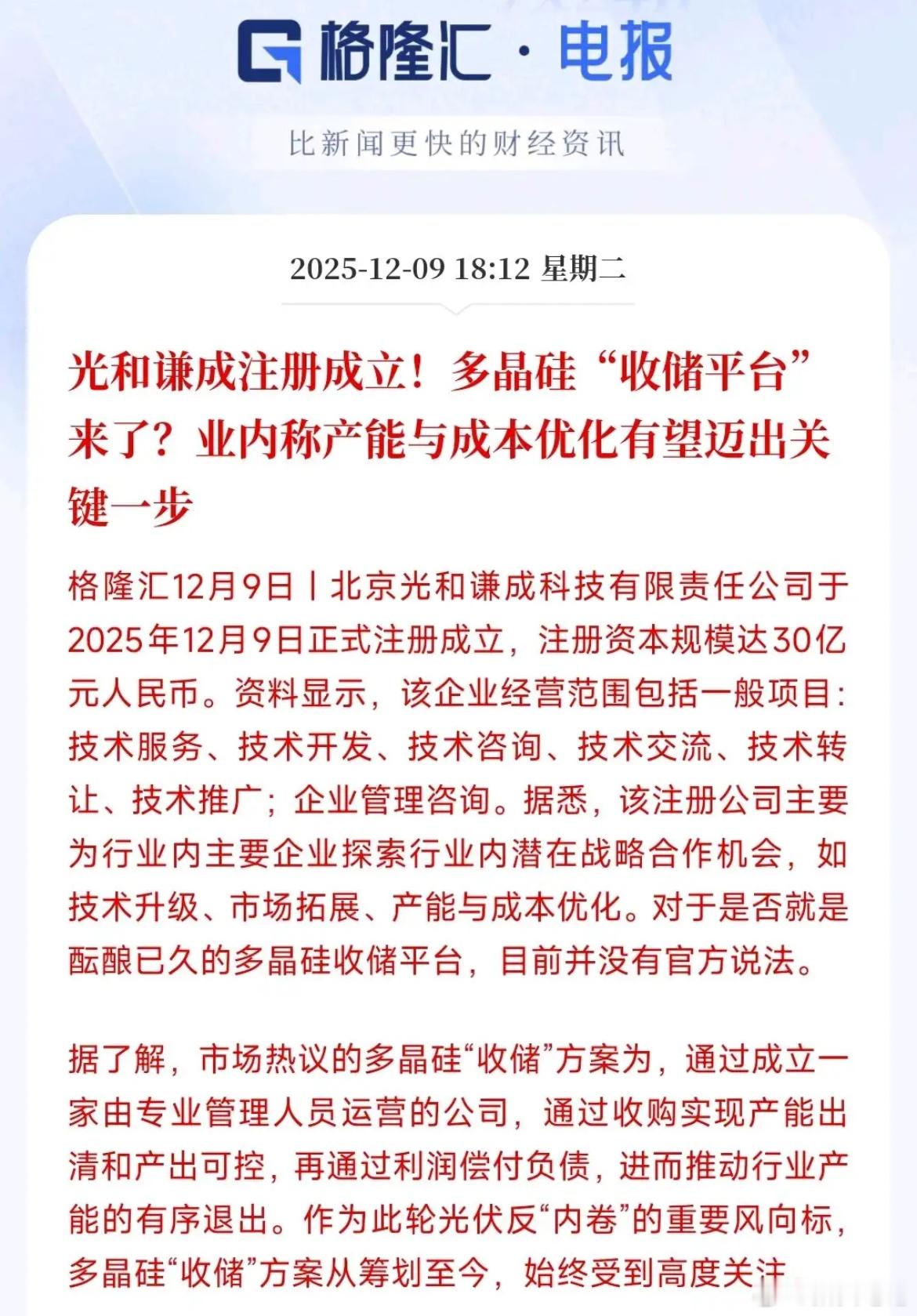 光伏重磅利好落地!收储平台成立,明天板块有望继续反弹光伏行业传来实打实的好消息,传了很久的多晶硅收储终于有实质性动作了!今天“光和谦成”正式注册成立,注册资本30亿,市场都把它看作多晶硅收储的核心推进平台,行业“反内卷”这下真的动起来了。有消息称,后续多晶硅售价会纳入收储相关成本,主流价格大概率稳定在每吨6万元以上,既能稳住市场价格,也能让企业盈利预期更明朗。其实今天下午市场已经提前反应,光伏板块突然直线拉升,龙头企业从跌超2%逆袭涨超3%,不少个股直接涨停或大涨,多晶硅期货主力合约也涨了3.45%,只是很多散户没跟上节奏。明天光伏板块大概率会成为市场焦点,反弹行情值得期待,后续走势可以重点关注。