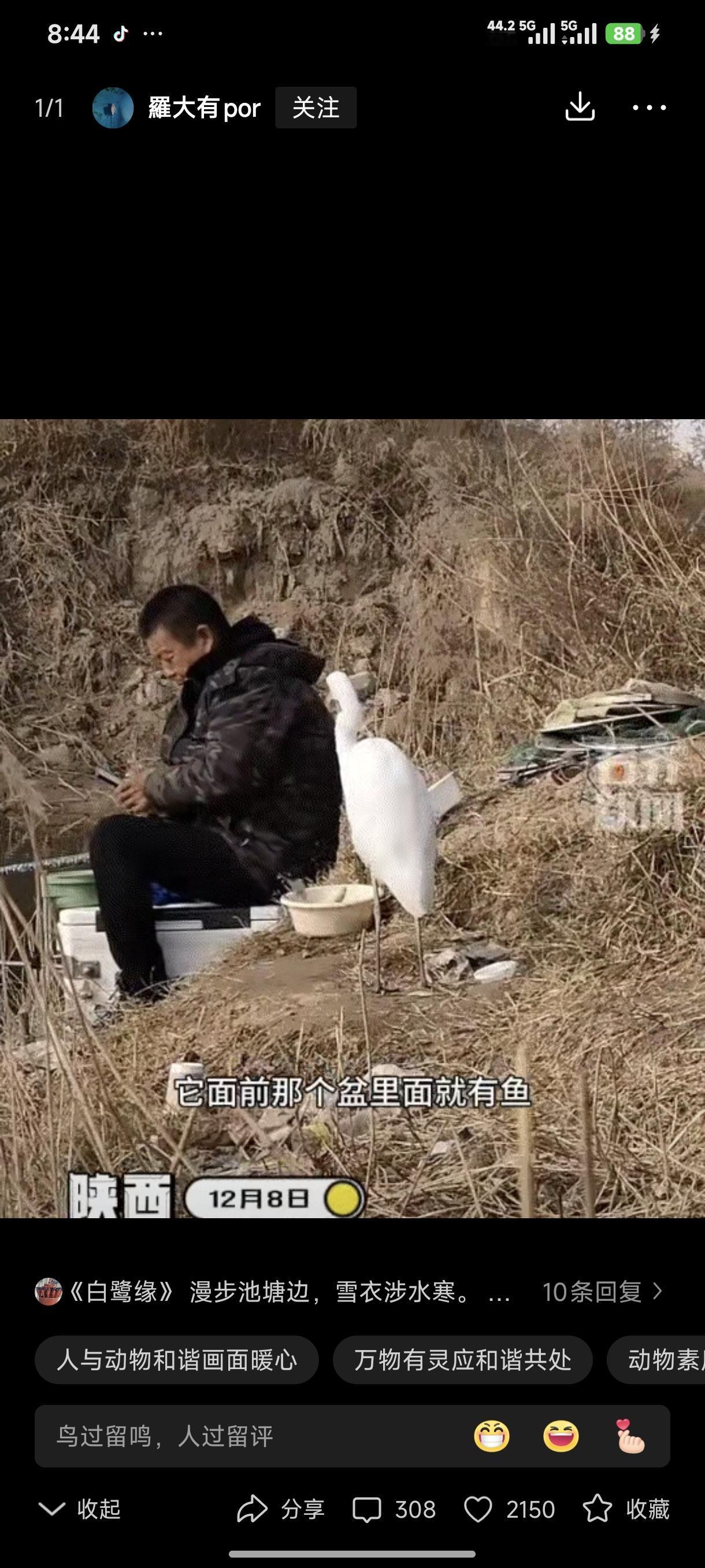 太和谐了!陕西,一男子在河边钓鱼时,竟看到旁边一位钓友,和一只野生白鹭和谐相处的一幕。视频显示,白鹭此时竟乖乖的站在这位钓鱼大哥面前,而大哥旁边盆里虽然钓了多鱼,但白鹭却并没有自己去抢食盆里的鱼,而礼貌的看着大哥,直至大哥将一条小鱼扔给它后,它才吃了那条鱼。而大哥趁其吃鱼时,也是一脸喜爱的为其拍照留恋。看着这和谐的场景,不知道的可能都以为白鹭是大哥养的呢。 白鹭要鱼吃,三亚冬季很多白鹭,我们公司也有很多白鹭,因为有湖和草地,吃虫子和小鱼。 这样的人和自然白鹭和谐相处真是很难得的啊!多么和谐温馨的画画。[赞][祈祷] 有爱心的钓鱼大哥,有礼貌的要鱼吃的白鹭,这种人和鸟的和谐场景太感人了。 我养的蛙差不多天天来偷吃,白鹭也是有害处的,很多养鱼户的鱼差不多给它吃绝了,一天来偷吃我蛙几次,一点办法都没有。 这画面,太温馨了,为什么我钓鱼遇不到这么通人性的白鹭啊。[捂脸] 我也遇到一次。那天在郊外钓鱼,一只大长腿白鸟(不认识)飞到离我五六米地方落下,我就把钓上的小鱼扔给吃了,鸟也不走,一会扔一个,持续了一个多小时。[捂脸]