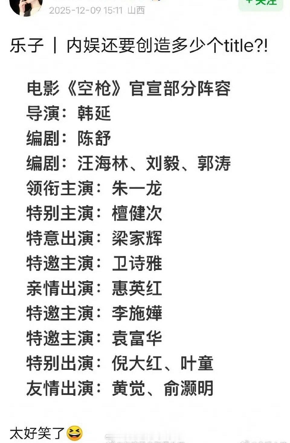 空枪 提前一个月单宣朱一龙,按宣传上来说是大男主也没错。就是这个title搞的太难看了,尤其是梁家辉那个特意出演,第一次看到,又一次拉低了内娱番位的含金量😹被人搞了好几个段子:观众特意不出演、观众无意出演、观众故意不出演,片方自己写的时候不怕被嘲吗?给人很不自信的感觉巨男主留给内娱的title不多了
