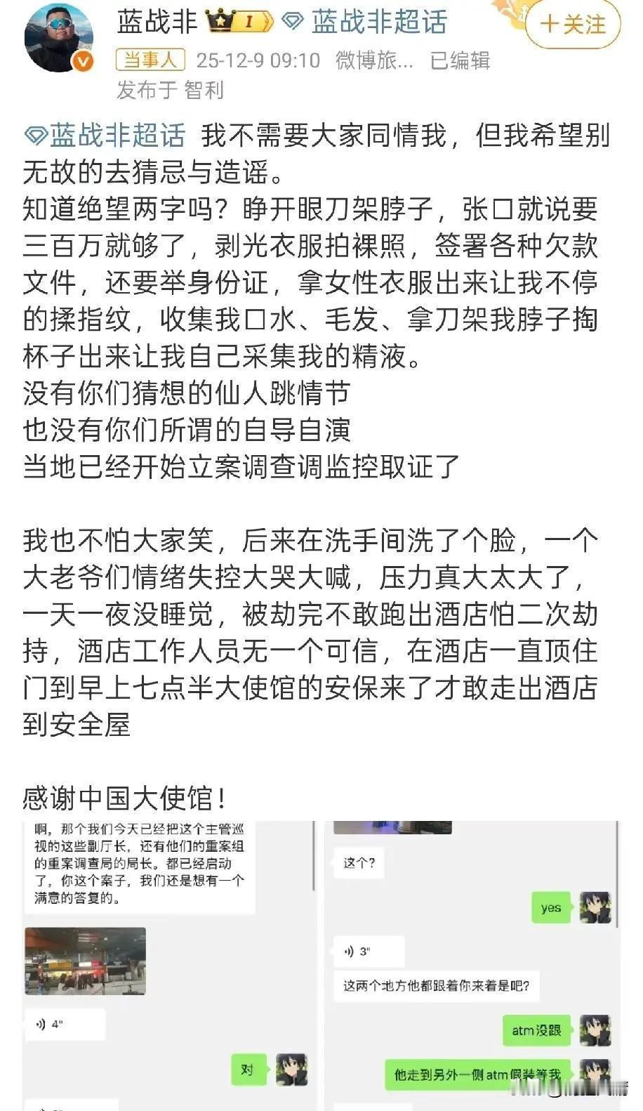 蓝战非南非遇劫:千万网红的5小时噩梦与网络暴力漩涡 当冰冷刀刃抵上脖颈,千万粉丝网红蓝战非在南非开普敦的五星级酒店,经历了一场持续5小时的精准猎杀。这场2025年12月的劫难,是绑匪提前半年布下的局——主谋是自称“铁粉”的中国男子,通过其直播直播泄露的行程锁定目标,买通机场与酒店人员,深夜持械闯入房间。 从逼转资金、刷网贷,到剥衣拍裸照、采集指纹毛发,甚至持刀胁迫其自行收集生物样本以伪造强奸证据,绑匪的手段远超普通勒索,更像一场摧毁受害者的精密算计。劫后,蓝战非用柜子顶住房门,崩溃大哭至天亮,直至中国大使馆安保人员抵达才敢离开。