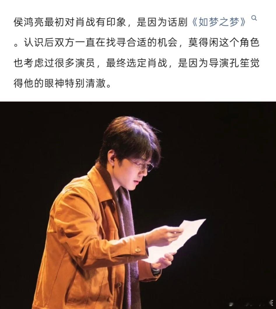 侯鸿亮最开始对肖战有印象是通过话剧《如梦之梦》,肖战在流量最顶的时候拒绝捞快钱的各种方式,去演了3年的话剧。一切的付出在当下可能看不到反馈,但是在后面,我们能看到,付出是真的有回报的,网友们甚至还放出来侯鸿亮看《如梦之梦》的照片,只能说好人有好爆了侯鸿亮最初对肖战的印象