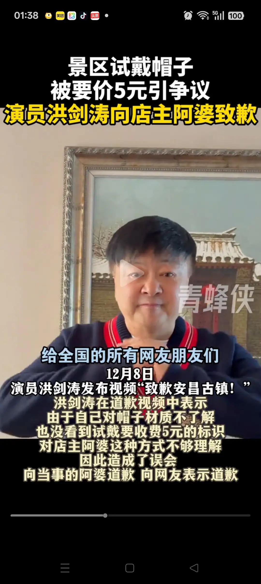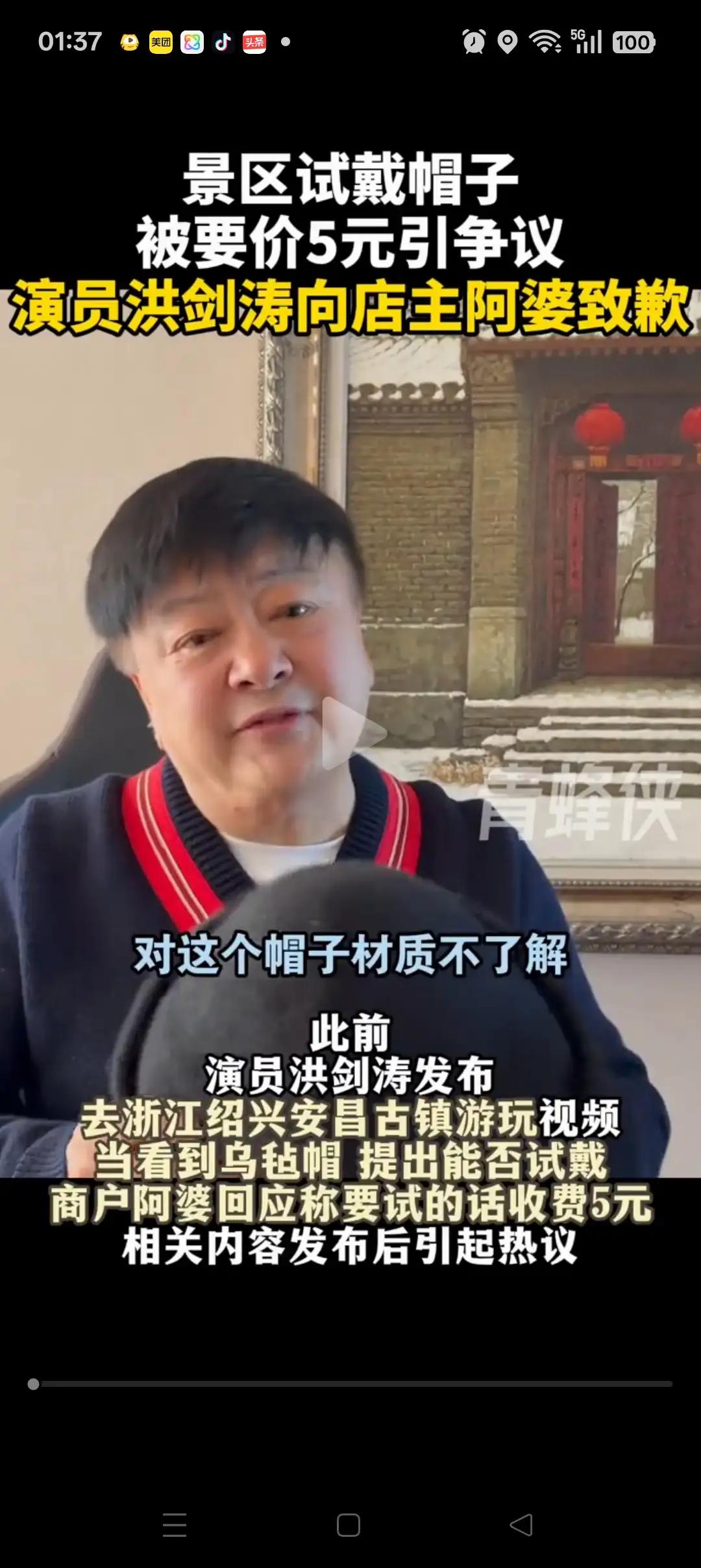 洪剑涛道歉了,他的事也给所有人都提个了个醒!那就是凡事都有两面性,特别是公众人物,在发视频时,应该考虑全面。不应该带有个人的情绪,就把视频公开! 三国时,就出现一次突破道德的下限,这又来一次,以后大家去试衣服,不买就得掏试衣费 坦率说,就好比以前的大户人家,对仆人丫环的苛求一样,高高在上,把服务无限扩大。可惜啊,没这个命了。[笑哭][笑哭][笑哭] 跟帽子材质无关。商家不同意试戴,买家不能强制要求试戴。没有从根本上认识错误也叫道歉? 其实是商户经常遇到打卡拍照📷的游客,不是真的试戴,还有也不认识洪老师,不然送他一顶都值了。 这老小子在刷纯在感贬低商家。浙江不欢迎,以后都不会看他的东西了。好好的人不做退休了就好好的呆家吧出来嘚瑟什么啊。