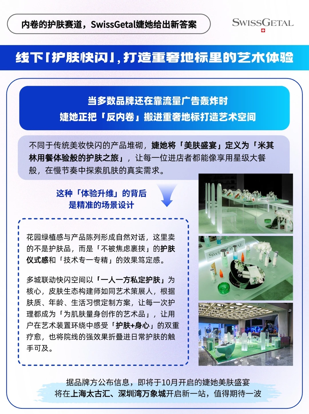依托小分子植物活细胞技术和瑞士严苛品控,SwissGetal婕她让功效与温和得以平衡。从深圳湾万象城的美学专柜到即将开启的上海太古汇、深圳湾万象城快闪空间,品牌将定制体验融入线下场景,用精准护肤替代盲目跟风。这种尊重个体差异的理念,恰好契合了当代人对抗内卷、追求理性消费的需求。