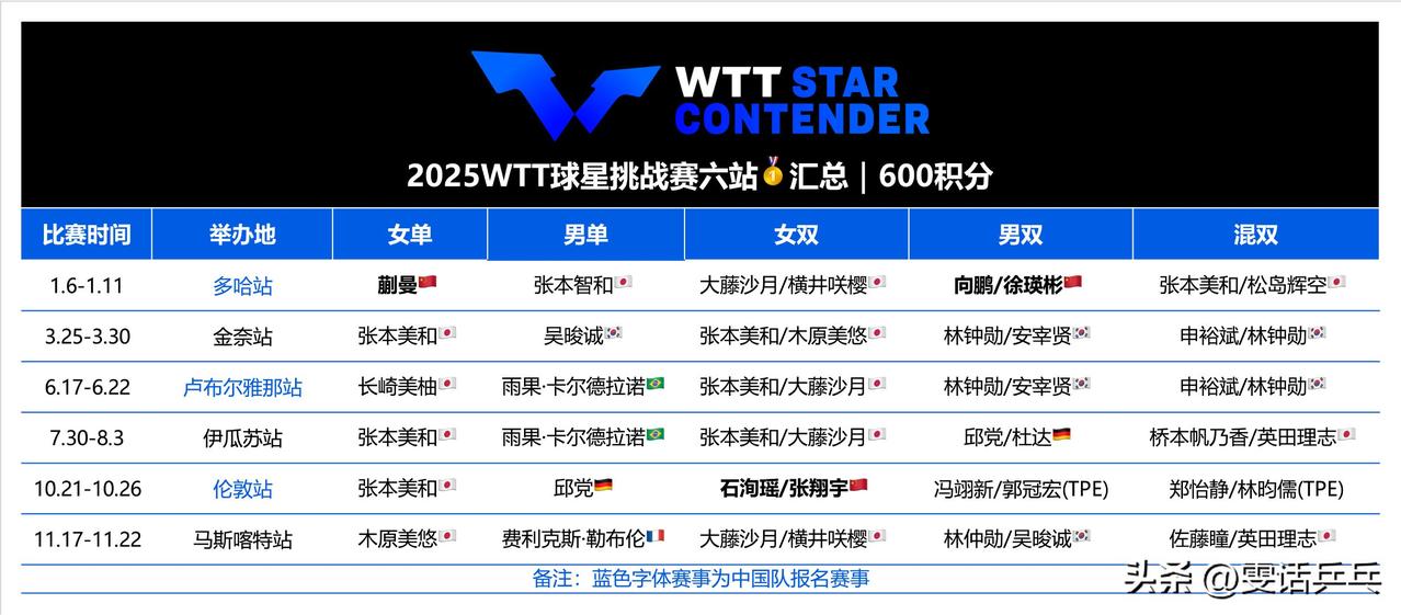 2025WTT球星挑战赛六站赛果汇总🔚 🥇🇯🇵X14、🇰🇷X6、🇨🇳X3、🇧🇷X2、🇩🇪X2、中国台北X2、🇫🇷X1 来源:@yyy_ynot 2025.12.9