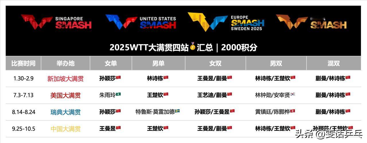 2025WTT大满贯赛事四站赛果汇总🔚 🥇🇨🇳X16、🇲🇴X1、🇭🇰X1、🇸🇪X1、🇰🇷X1 来源:@yyy_ynot 2025.12.9