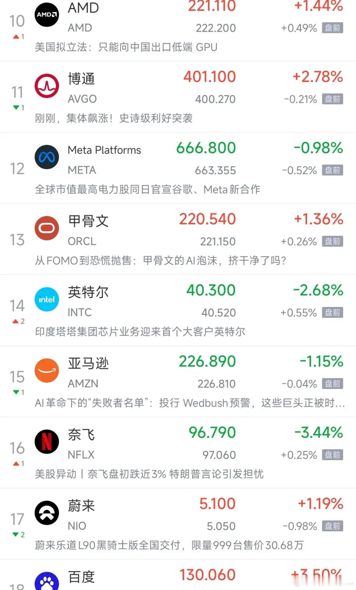 美联储12月降息概率已升至86.9%,落地几乎成定局,但内部分歧明显,不少官员明确反对降息。按照惯例,大概率会先宣布降息,再搭配鹰派表态给市场降温。这种操作让美股陷入两难,降息预期受挫。从今日盘前表现就能看出端倪,多数大型科技股走弱,Meta跌0.52%、亚马逊微跌0.04%,仅英伟达靠利好小幅上涨0.71%。美联储降息后的后续政策走向,不仅会直接影响美股和全球经济走势,A股也将受到波及,接下来就看鲍威尔明天的讲话如何定调。