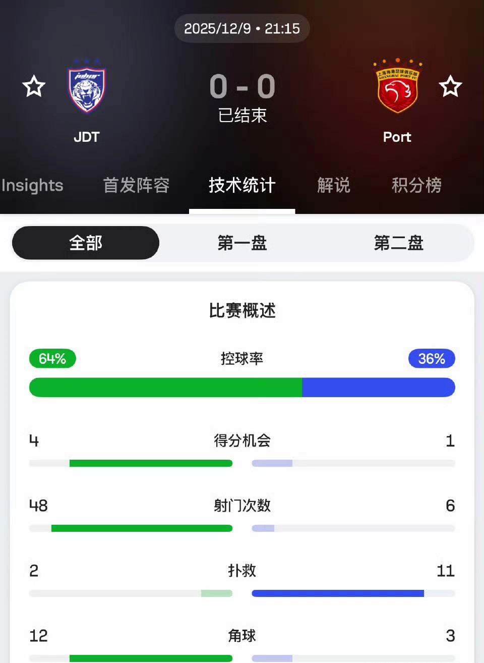 海港作为中超联赛冠军,亚冠赛场6场不胜,2平4负排名垫底。 不过昨天这场跟柔佛的亚冠比赛倒是踢出了血性。海港在控球率和射门次数远远不如对方,但最终0-0逼平了。 柔佛全场硬是射了48脚,海港仅6脚,控球率36%对64%。