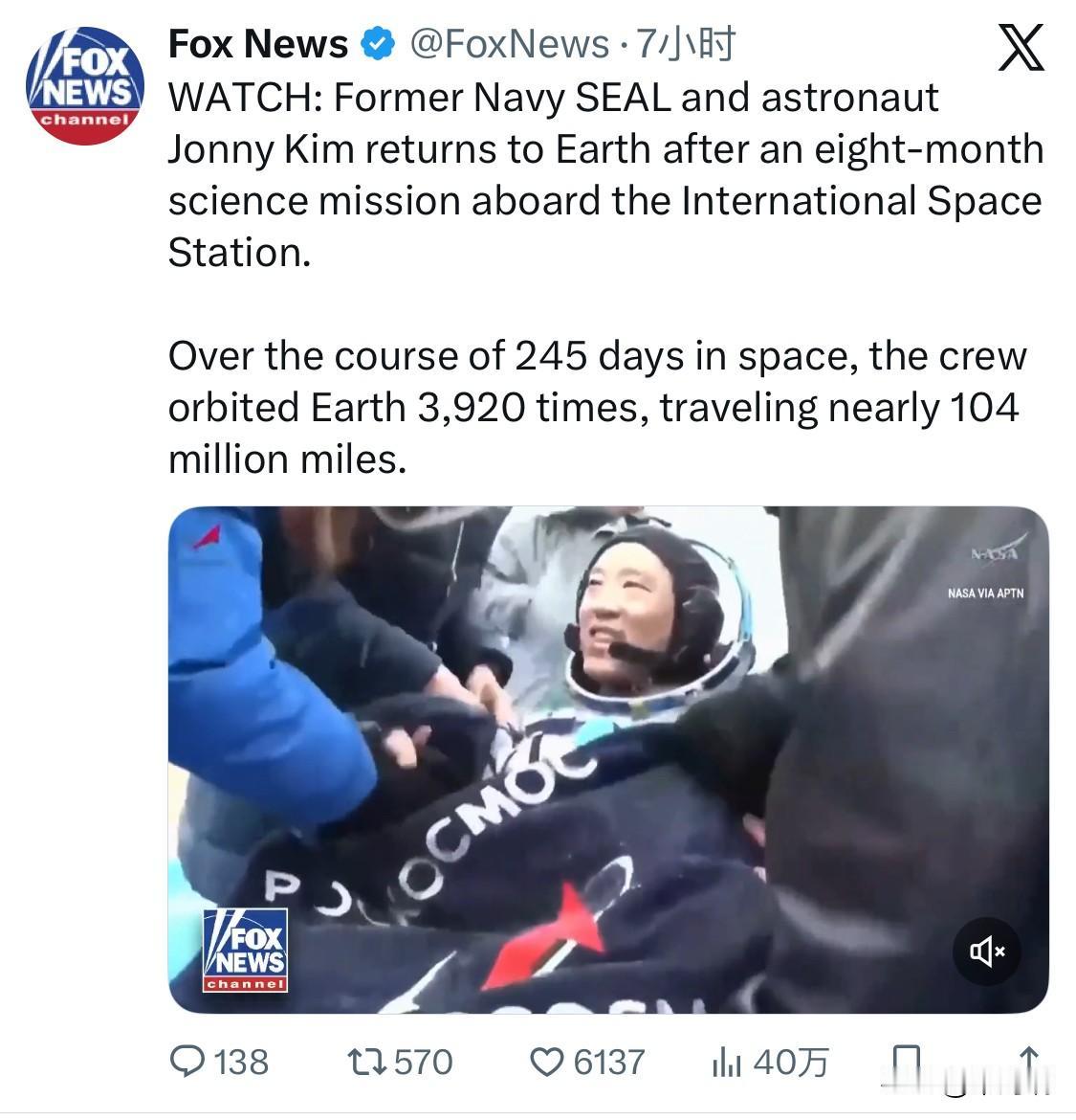前美国海军海豹突击队员兼NASA宇航员 Jonny Kim (乔尼·金)在国际空间站完成为期八个月的科学任务后返回地球。 在太空中的 245 天里,宇航员绕地球飞行了 3920 圈,行程近 1.04 亿英里。 在空间站期间,Jonny Kim (乔尼·金)进行了科学实验和技术演示,支持了未来的 Artemis 登月任务。 他是2025 年 4 月 8 日乘坐俄罗斯联盟 MS-27 (Soyuz MS-27) 飞船前往国际空间站的,执行了他首次为期八个月的太空任务。 Jonny Kim(乔尼·金)是韩裔美国人,他出生在加利福尼亚州洛杉矶,父母是 1980 年代初从韩国移民到美国的移民。 他是第一位进入太空的全韩裔血统的美国宇航员。