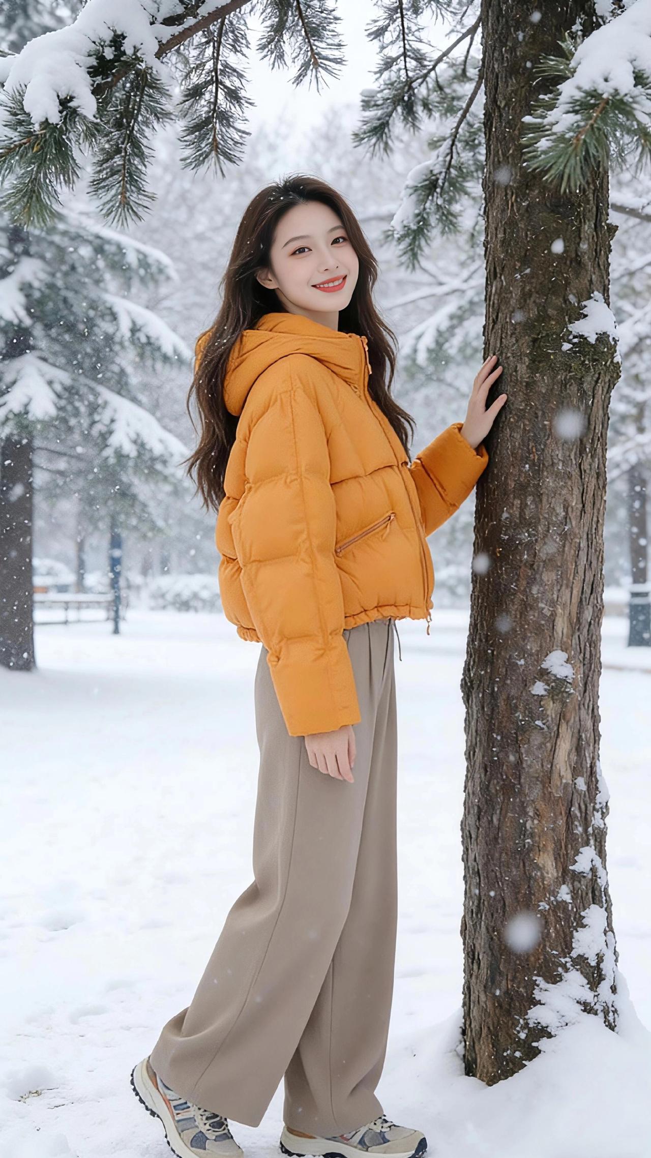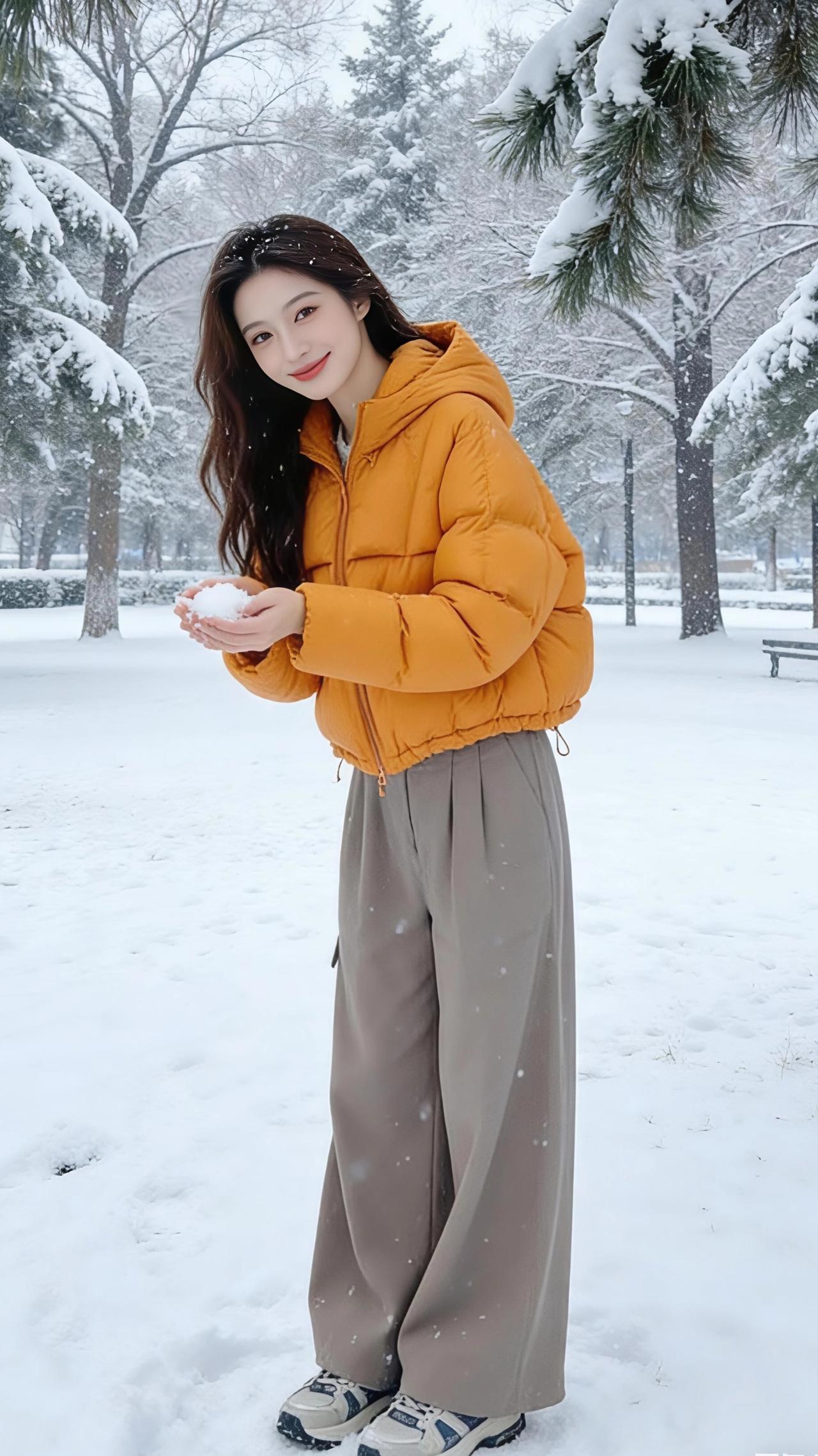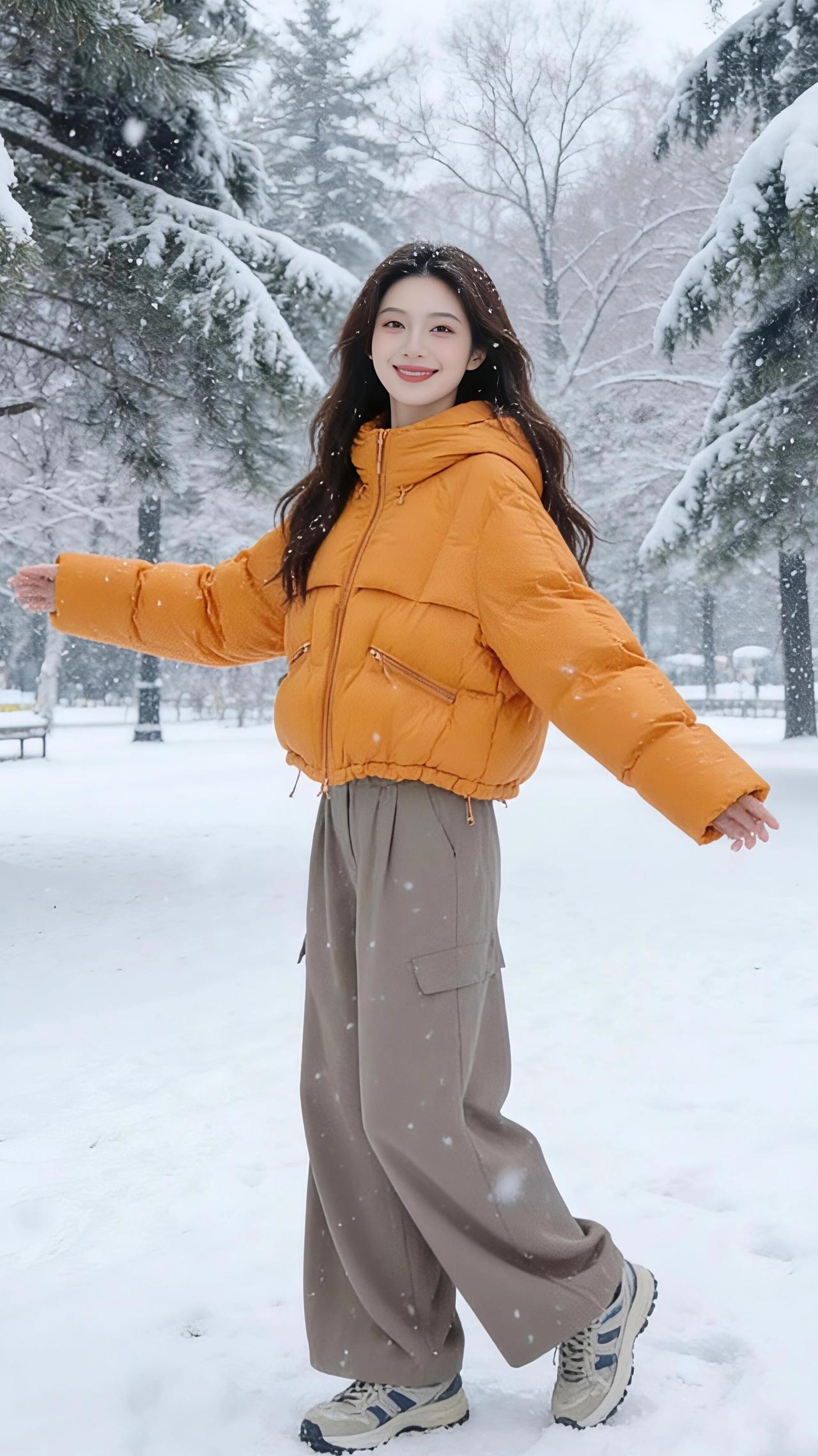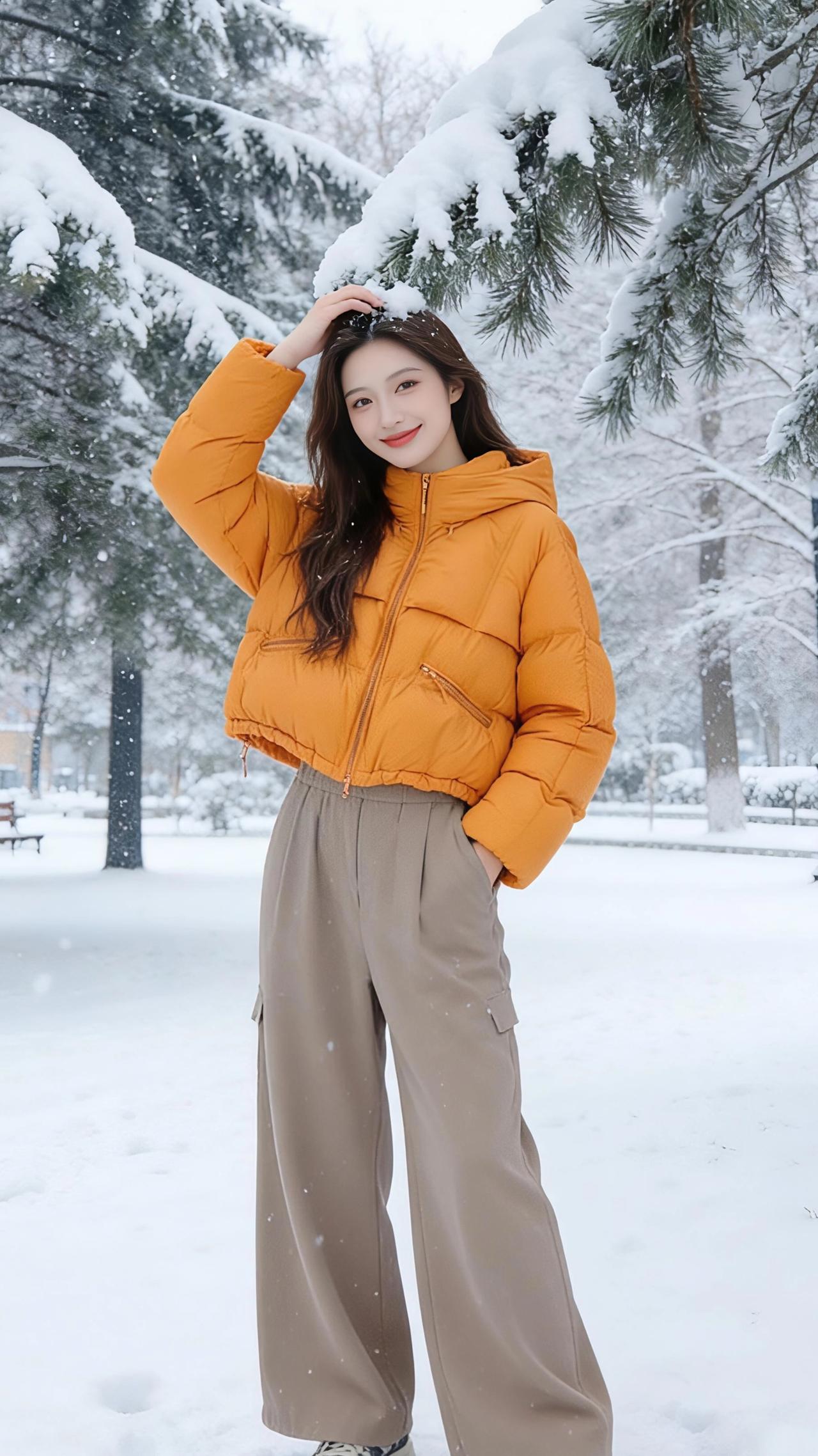 雪落满公园的松枝时,她像裹了团暖橘色的光,撞进这素白的天地里。 绒绒的雪粒沾在发梢,风一吹便簌簌落进衣领,她却偏要伸手接一捧,指尖的凉意裹着松针的香,漫过阔腿裤的褶皱,又随运动鞋踩碎的雪声,轻软地散在空气里。 身后的树挂垂着冰棱,她倚着树干笑,暖黄的衣摆晃着,把冬的冷意都揉成了软和的诗。连落雪都慢下来,落在她抬臂的弧度里,落在她插兜时露出的半截腕子上,像把这季的温柔,都妥帖地藏进了她的衣褶里。 原来冬从不是冷的,是有人带着橘色的暖,踩着碎雪走来,让每片落白,都成了落在心上的轻吻。 高级感穿搭 小个子穿搭 冬季穿搭 外套穿搭