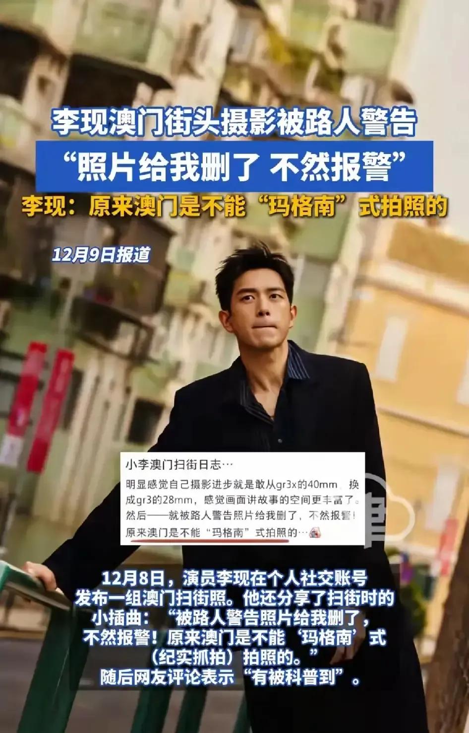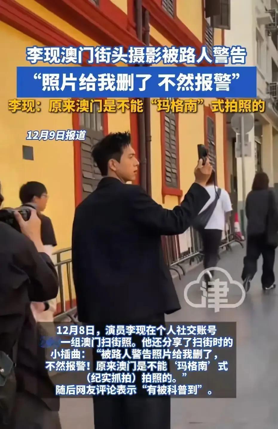 李现在澳门举着手机拍街景,被一位大叔冲上来拦住,说再拍就报警。 他当场删图,回头发微博自嘲“原来我也成了被防着的街拍对象”我看报道说澳门法条写得明白,把路人脸拍清楚就算侵权,游客踩坑的真不少。 明星也一样,镜头对准谁就得先征得点头,不然真能吃官司。 李现没摆谱,删得麻溜,还顺道给粉丝科普,一句“虚惊一场”把尴尬化成提醒,情商确实在线。 路人大嗓门听着吓人,可规矩就是规矩,谁让咱们不懂人家的红线。 以后出门做功课,比滤镜更重要。 公众人物更得带头守法,不懂就问,错了就改,比事后公关强百倍。