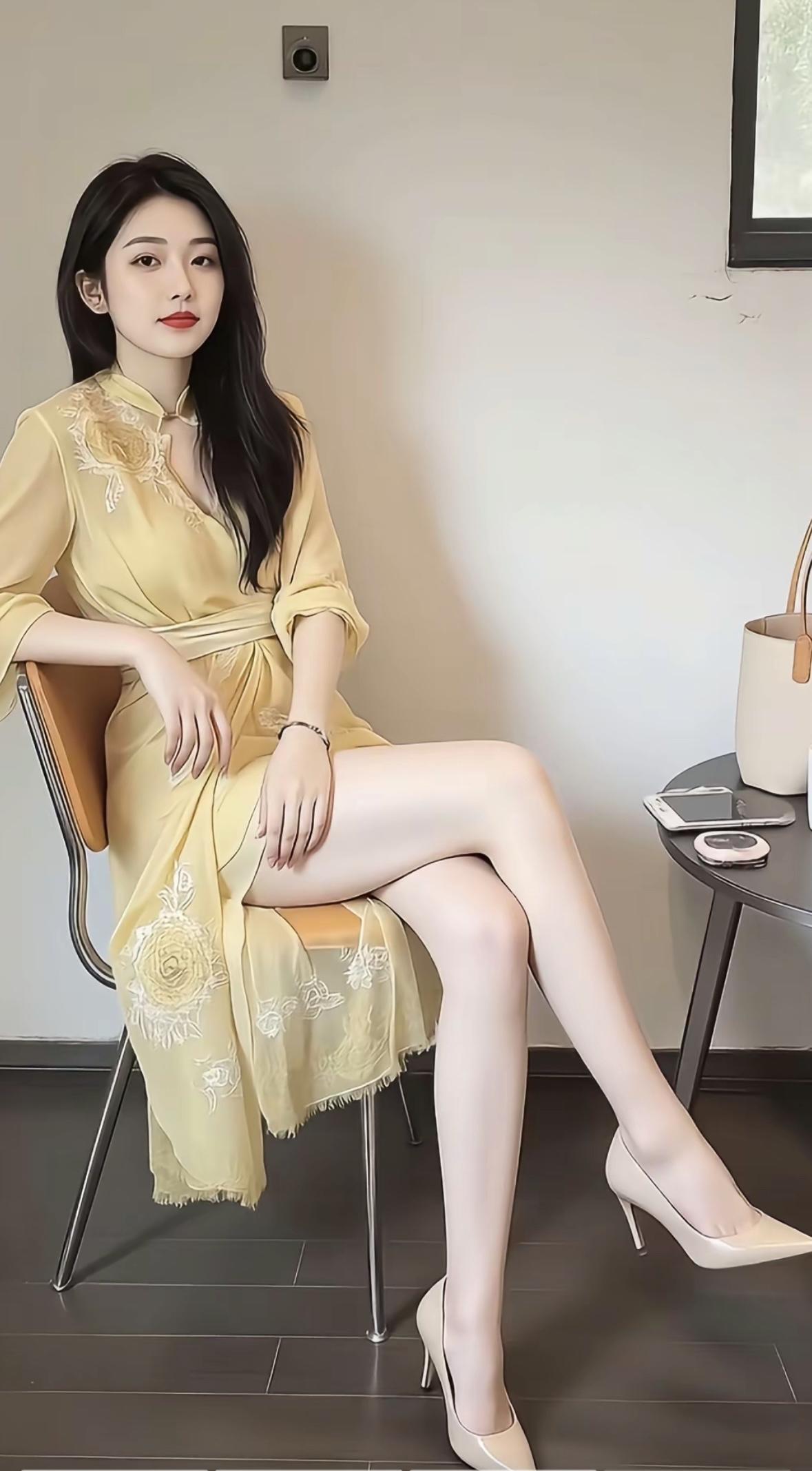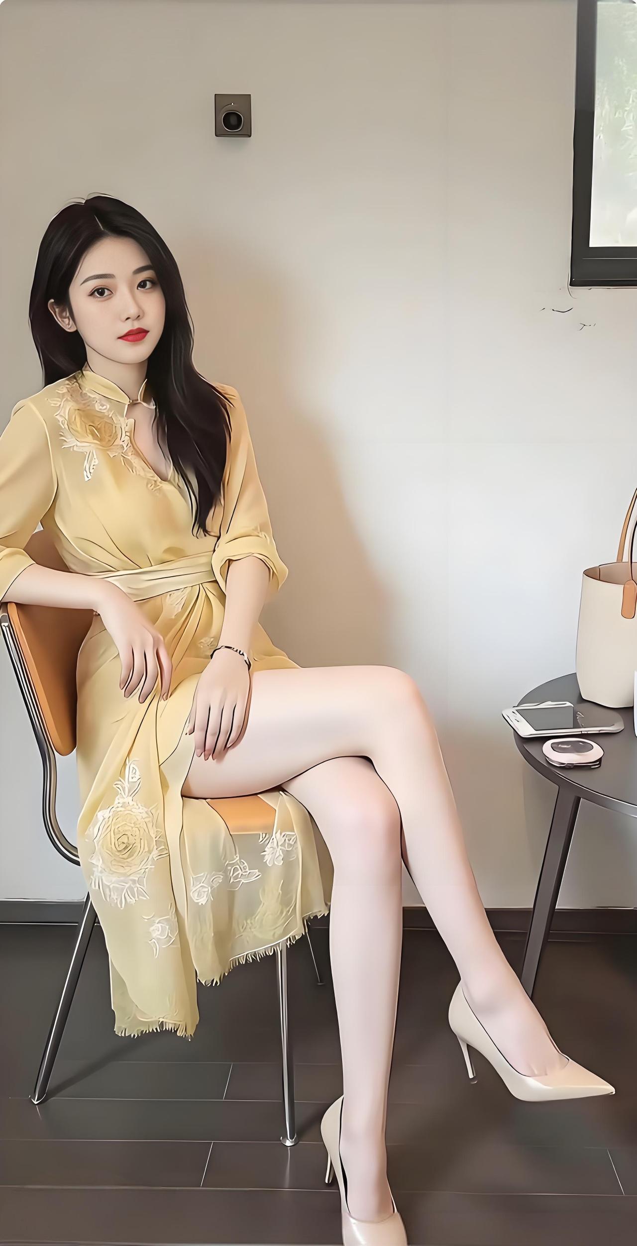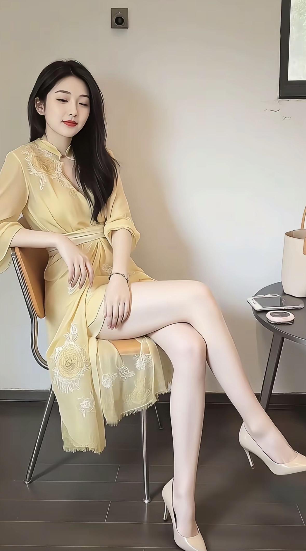 优雅气质穿搭,浅黄色连衣裙搭配高跟鞋,尽显女性魅力。