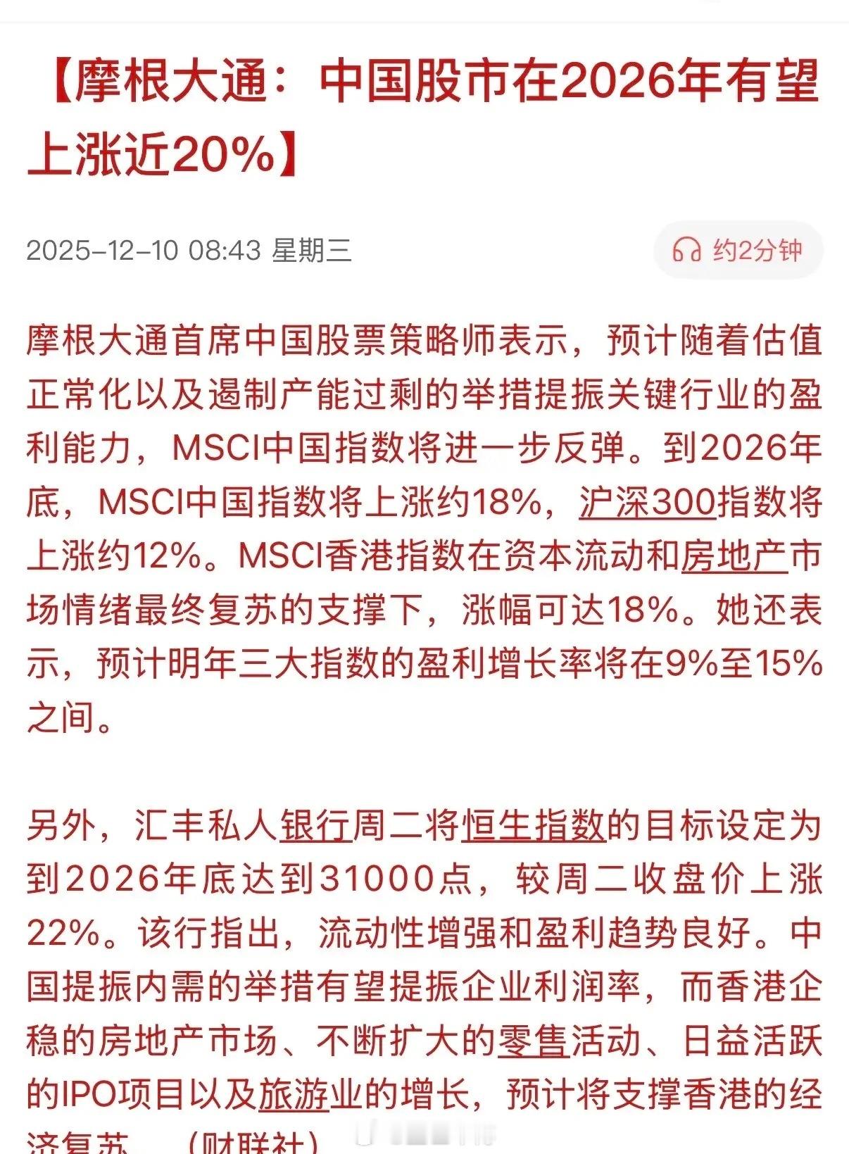 “大胆”的外资投行调高预测2026年中国股市涨幅度为20%,意味着A股可以再涨800点左右,沪指应该可以站稳4500点上向!其给出的理由非常简单,就是“估值正常化以及遏制产能过剩的举措提振关键行业的盈利能力,MSCI中国指数将进一步反弹”。充足的理由还是中国核心资产物美价廉,在全球资产很难找到像中国优质股票,并且有人工智能、量子科技、机器人、生物学科、航天航空、无人机等等科技企业的赋能。正是外资投行最为看好市场,才敢如此“大胆”预测2026年中股市的上涨的幅度!