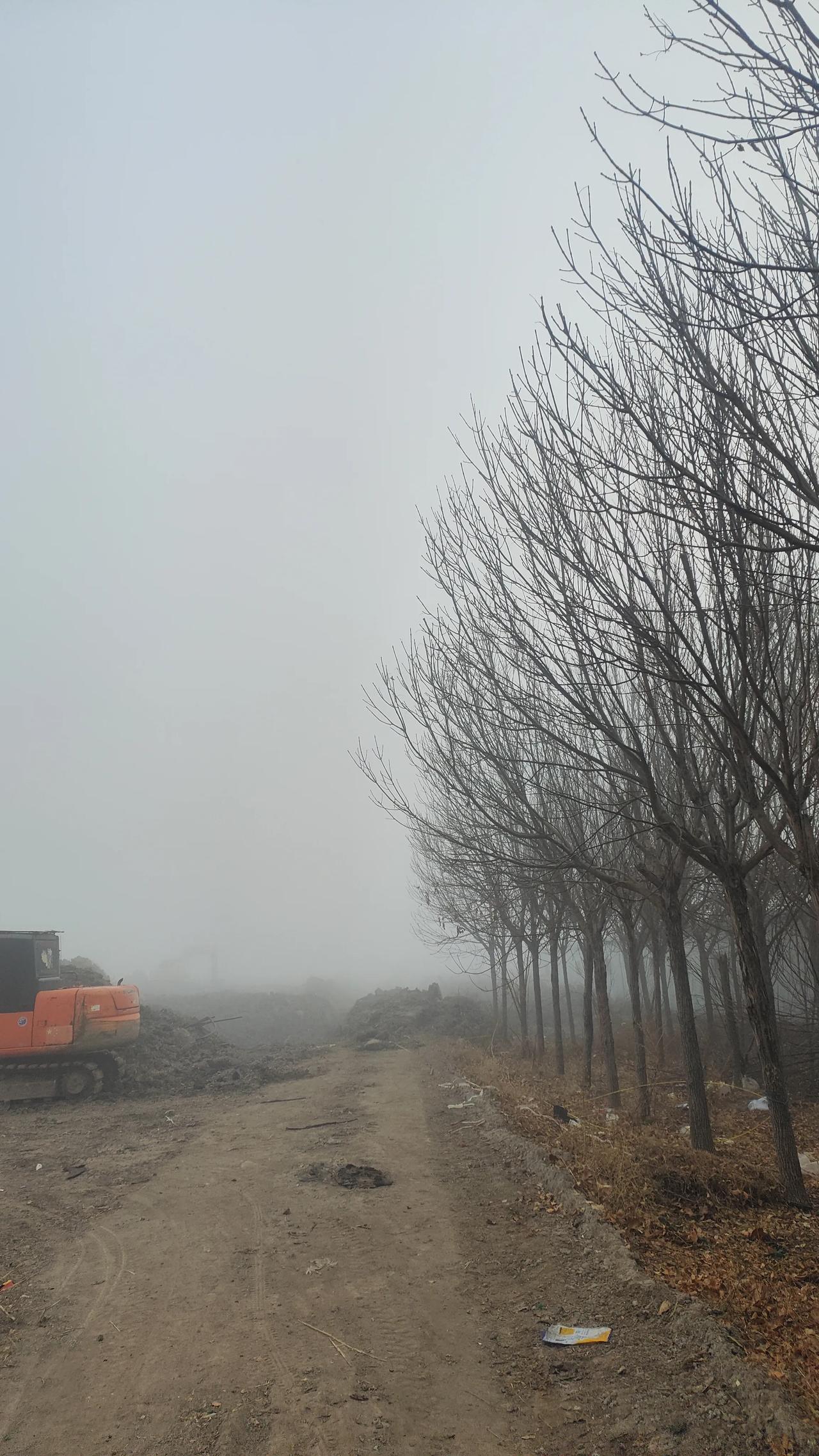 今天这雾也太大了,出门跟蒙了层纱似的。顺着土道走,脚底下坑坑洼洼的,没留神差点踩泥里。 右边那排树都秃着枝桠,雾裹着它们,瞅着跟画里那冷清劲儿似的。左边停个挖掘机,旁边堆着些土坷垃,也叫雾盖得模模糊糊。 风一吹,地上那碎纸片还打个旋儿。这天气出门,总觉得连喘气都带点潮乎乎的,还是赶紧往回颠吧。
