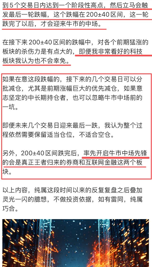 本文重要:图中的文章是我昨天早上开盘前写的,这是目前阶段我对于大盘过去走势的思考以及对于这一轮牛市最新的总体定性,我认为是值得反复仔细看的。 虽说我们处于一轮史诗级的牛市当中,这一路之上荆棘丛生,坑坑洼洼,有些坑避无可避,有些坑可以绕着道走。 目前的市场我认为处于前场与中场的交接处,中场的上升空间无意是巨大的。但牛市的中场开场前,是不会带着满车的散户一路扶摇直上的,必须有一个坠落的冰点,然后冷冷清清,悄无声息地出发 虽然我也不希望这样,但这就是市场,我也没有办法。