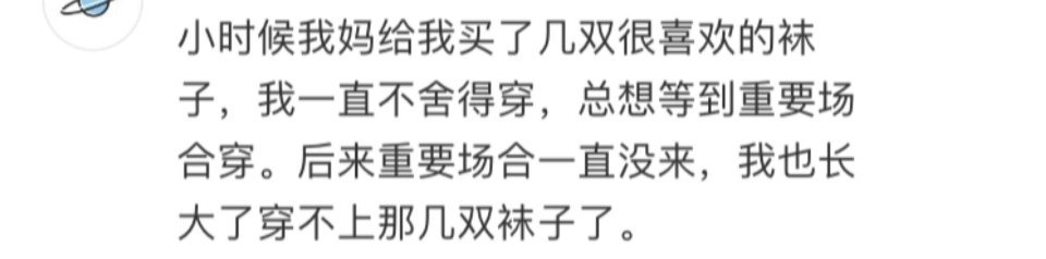 小时候我妈给我买了几双很喜欢的袜子,我一直不舍得穿,总想等到重要场合穿,后来重要场合一直没来,我也长大了穿不上那几双袜子了。