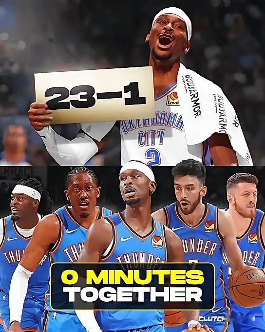 雷霆现在强到离谱了!赛季至今23胜1负,而他们的首发五人组从未同时出场过!首发5人:亚历山大、杰伦威廉姆斯、多尔特、霍姆格伦、哈腾。赛季初是杰伦威廉姆斯一直受伤,随后霍姆格伦、多尔特受伤,霍姆格伦伤愈复出,哈腾又受伤了,只有老大亚历山大一直在打球,最近面对爵士,才轮休了一场。这帮人,本赛季从来没有向联盟展示过他们的最强战力,然后轻松拿了23胜1负,联盟断档第一的战绩。还有,这24场比赛,有一半都三节打卡了,太离谱了....