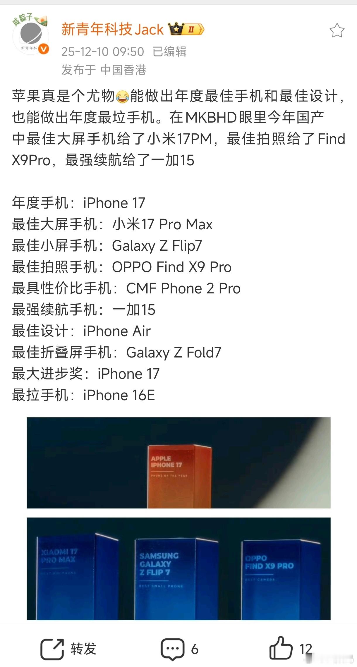 MKBHD 眼里的年度最佳手机,国产中小米、OPPO 、一加都有所斩获。小米17 Pro Max 最佳大屏手机OPPO Find X9 Pro 最佳拍照手机一加 15 最佳续航手机