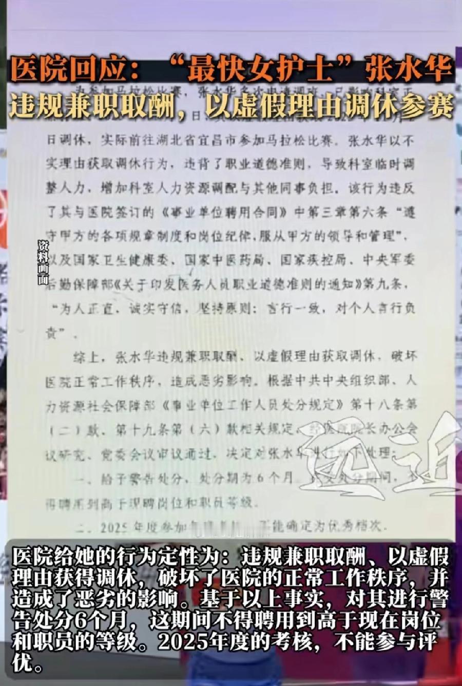 张水华被单位警告处分!不能评先评优了,不过今后想再两头吃,肯定不行了!为了参加马拉松,虚假理由请假,以后再请假肯定从严审批,家里私事都麻烦,还怎么参加比赛?违规兼职取酬,不只是比赛奖金,与运动品牌公司商业合作!这性质就不一样了!不过张水华还是赚大了,四场比赛奖金挣了23万,又没说退出来!只是今后工作与比赛如何兼顾,只一个大难题了!