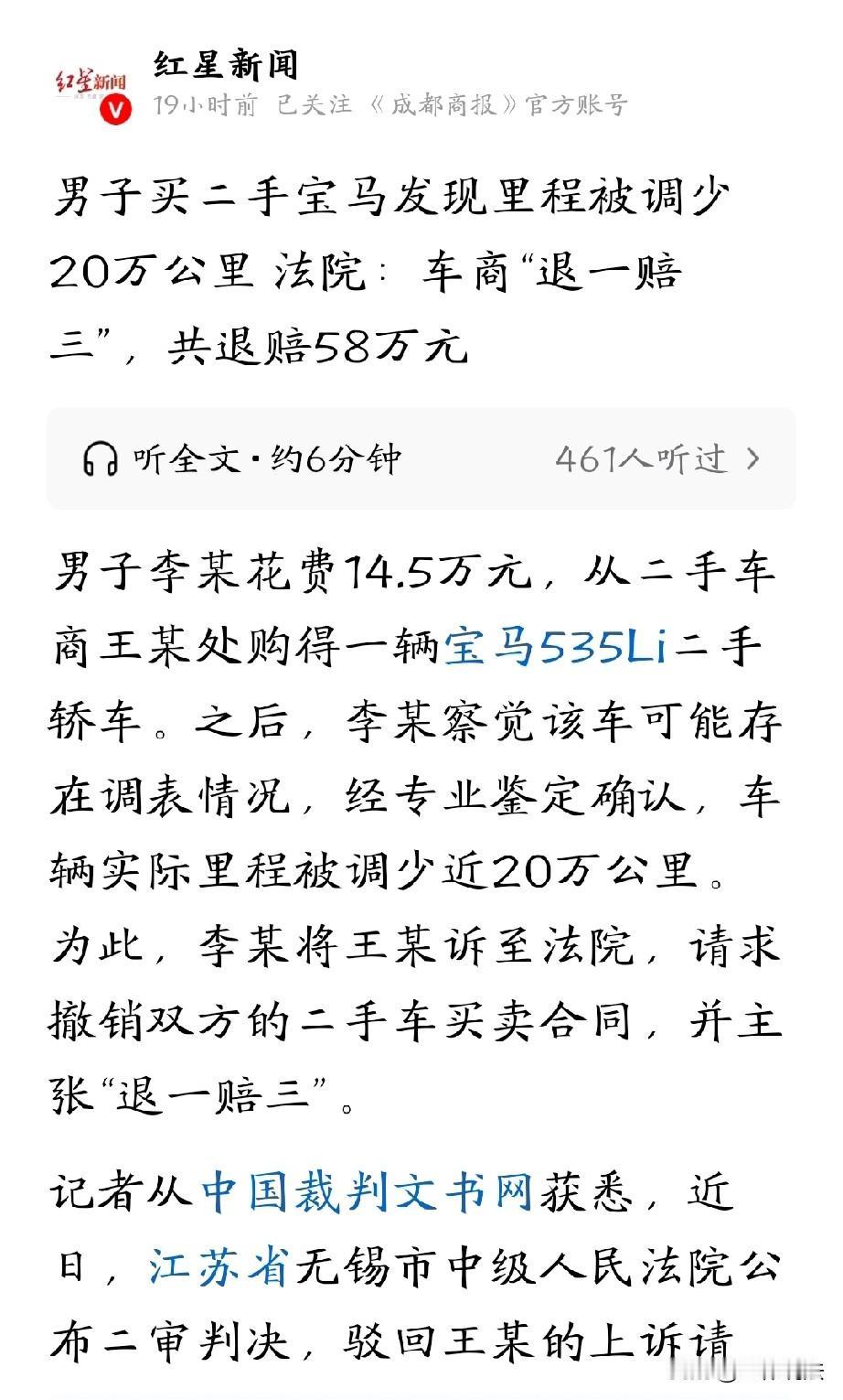 江苏无锡,男子看中了一辆宝马535Li的二手轿车,老板告诉他车况属于精品,而且里程表上只有17万多公里,男子瞬间心动,花14.5万买到了手。可没开几天,男子就发现仪表盘上数字乱跳,他突然察觉到,这辆车可能存在调表情况。为了打消心中疑虑,他咬牙花3万元做了专业鉴定,竟然发现,车子实际里程被调少了近20万公里。男子觉得自己像冤大头被宰了,一气之下告上法庭,要求退一赔三。 王某主要从事二手车买卖,2023年11月,他为了吸引买家,在自己的微信朋友圈发布了关于一辆宝马535Li二手轿车的照片和信息。 大约一个月后,李某看到了王某发布的这辆宝马信息,产生了购买兴趣。他通过微信联系了王某,特别询问了该车的车况和行驶里程数。 王某在回复中强调,车辆状况属于精品级别,并向李某发送了车辆的出险记录、4S店维修保养记录以及一张显示里程数为176637公里的仪表盘照片。 这些信息让李某对车辆状况,尤其是相对“较低”的里程数感到很满意。 2024年1月1日,李某实地查看了这辆宝马,感觉车况不错,便当场向王某支付了5000元作为定金。 一周后,李某将剩余的14万元购车款转入了王某指定的一个名叫庞某的银行账户,庞某随后将全部款项转给了王某,李某则开走了这辆宝马车。 但李某的高兴并没有持续太久,一周之后,李某在驾驶过程中突然发现车辆的仪表盘显示的里程数异常跳变,数值猛增到了29万公里左右。 这让李某非常震惊,他立刻联系了王某询问原因,王某对此表示自己也不清楚具体原因,需要询问汽修师傅。 李某越想越不对,强烈怀疑这辆车的里程表被篡改过。 对此,王某坚决不承认,李某一气之下告上法庭,请求撤销双方签订的二手车买卖合同,王某退还全部购车款14.5万元,并给他三倍赔偿,即43.5万元,总计58万元。 在案件审理过程中,法院应李某的申请,委托了专业评估公司对涉案宝马车的实际里程数以及是否被调整过进行鉴定。 鉴定结果显示:该宝马车的里程数确实被调整过,且有过两次调表行为。 第一次调表发生在2021年11月,第二次调表发生在2021年11月至2022年6月之间,这两次调表行为均发生在李某买车之前。 鉴定机构估算,截止2024年1月,该车辆的实际累计行驶里程已超过375089公里。 白纸黑字面前,王某无奈承认,他在出售这辆车时,其实已经意识到仪表盘显示的里程数可能不准确。 因为该车最后一次在4S店保养是在2017年9月,当时的记录里程是121034公里。 从2017年9月到2023年12月,长达6年多的时间里,车辆只增加了约5万公里,明显不符合常理。 但王某声称,自己当时已将里程数可能不准的情况告知了李某,但李某坚决否认。 《民法典》第148条规定:一方以欺诈手段,使对方在违背真实意思的情况下实施的民事法律行为,受欺诈方有权请求人民法院或者仲裁机构予以撤销。 法院审理认为,王某作为专业二手车经营者,售车时明知表显里程与实际严重不符却故意隐瞒,还提供仅显示176637公里的仪表盘照片。 但是,他未如实告知里程异常的关键事实,导致李某基于错误认识订立合同,其行为构成故意隐瞒真实情况,属于欺诈。 而且,鉴定报告证实,车辆在售前即被两次调表,实际里程远超表显里程。 双方签订的《车辆转让协议》中虽有“车辆状况以实际为准,表显公里数不代表实际公里数”的条款,但法院认定,该条款系王某提供的格式条款,其内容不合理,属于无效条款,不能作为王某免除责任的依据。 因王某的欺诈行为,李某有权依法撤销双方之间的二手车买卖合同。 合同撤销后,王某应返还李某购车款14.5万元,李某则需将涉案宝马车返还给王某。 同时,依据《消费者权益保护法》第55条第一款:经营者提供商品或者服务有欺诈行为的,应当按照消费者的要求增加赔偿其受到的损失,增加赔偿的金额为消费者购买商品的价款或者接受服务的费用的三倍;增加赔偿的金额不足五百元的,为五百元。 王某欺诈行为确凿,他还应赔偿李某相当于购车款三倍的损失,即43.5万元。 因此,法院作出一审判决: 撤销李某与王某之间的二手车买卖合同关系,王某向李某返还购车款14.5万元,并赔偿43.5万元,李某向王某返还所购的宝马535Li二手轿车。 王某对此判决结果不服,再次提起上诉,二审法院驳回上诉,维持原判。
