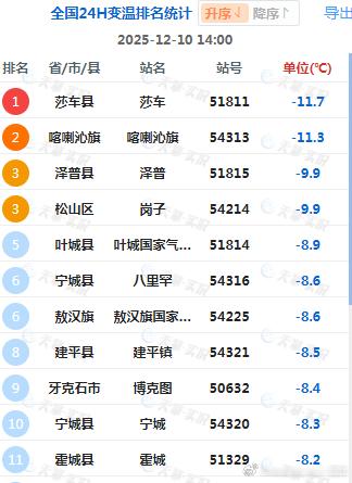 【降温】今天部分冷空气的先遣团从贝加尔湖一带南下,导致内蒙古多地率先出现降温。寒潮的主体冷空气+阴云遮挡光照,新疆西部一带也出现降温。新疆莎车降11.7℃、内蒙古喀喇沁旗降11.3℃、辽宁建平镇降8.5℃,为14时各自省区降温最强站点。
