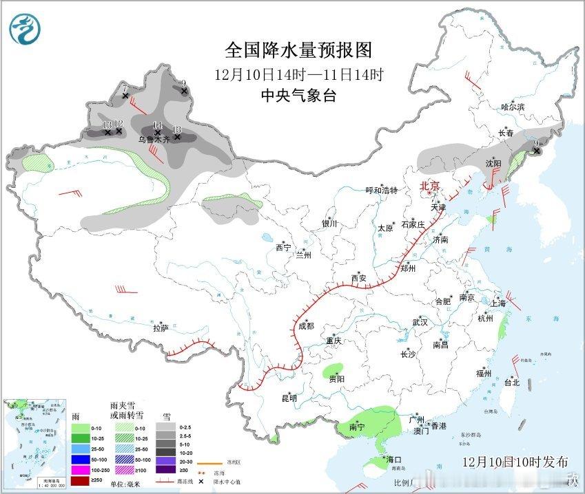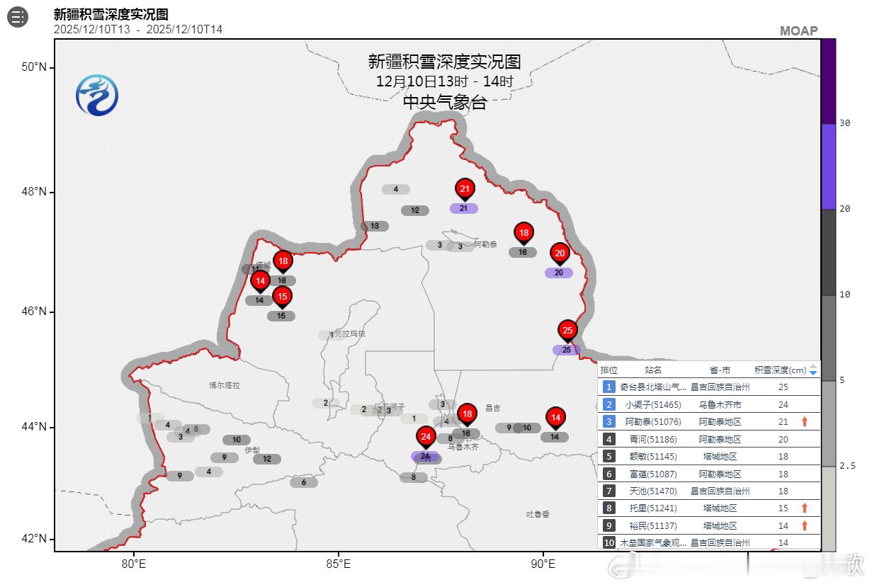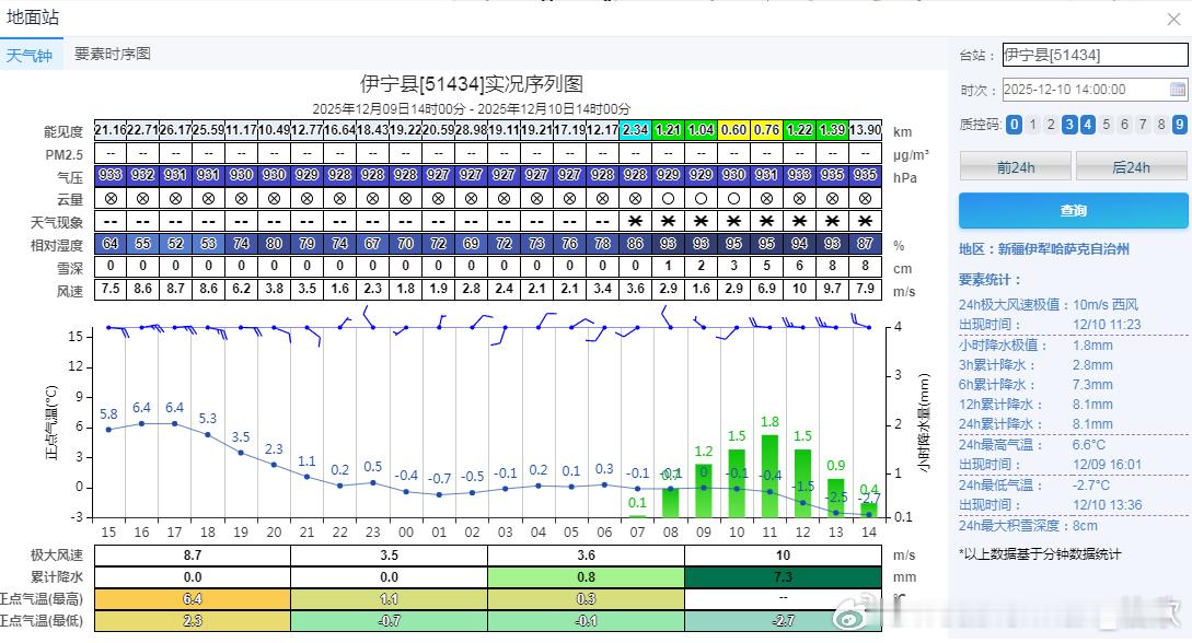 【降雪】今天08-14时,受到寒潮影响,新疆西部和北部已经出现明显降雪。伊宁县6小时5.8毫米,至少已经是大雪级别,14时积雪增厚到8厘米。阿勒泰积雪增加到21厘米。今天下午到明天中午,新疆还有明显降雪,伊犁河谷和天山沿线附近有大雪-暴雪。乌鲁木齐今夜到明晨就可能有暴雪。