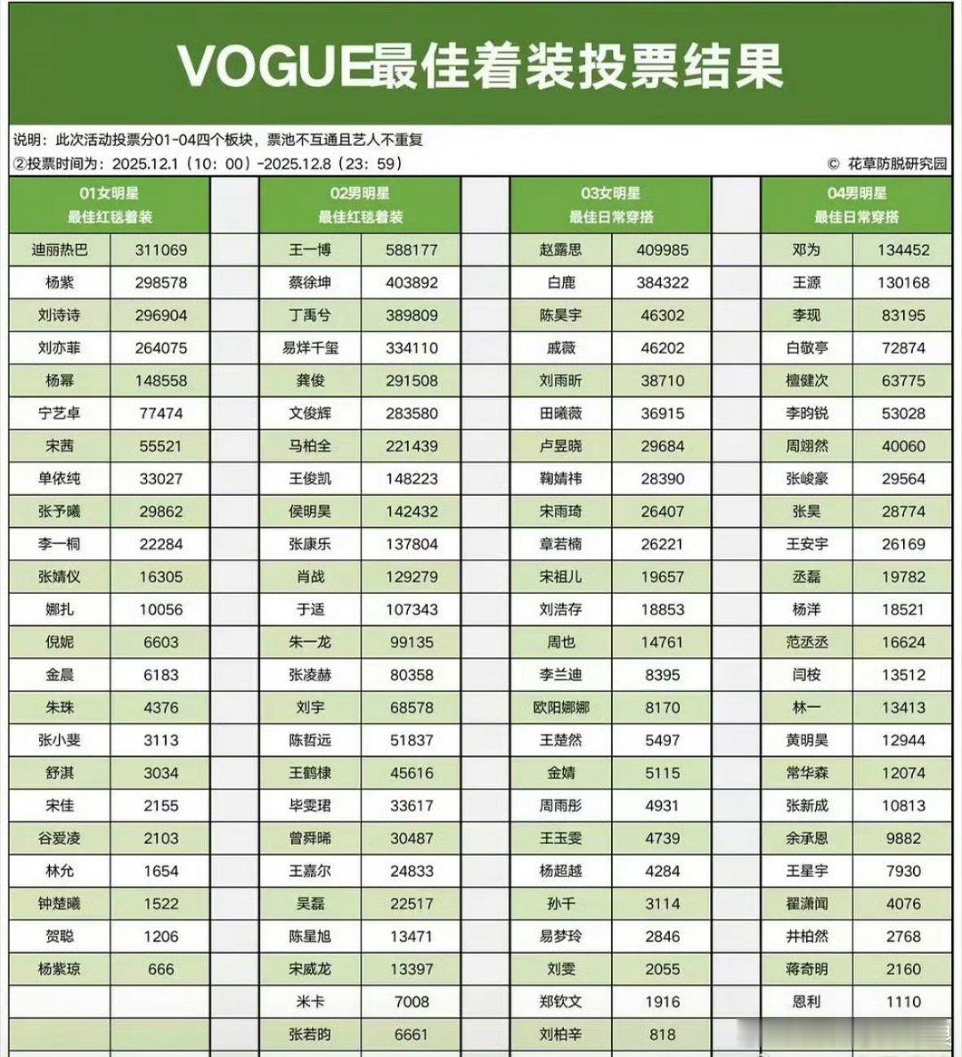 VOGUE最佳着装票选结果表,里面有你觉得着装很棒的明星吗