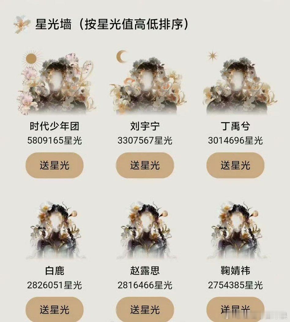星光大赏星光墙TOP6:男顶时代少年团、刘宇宁、丁禹兮女顶白鹿、赵露思、鞠婧祎 尤其白鹿赵露思鞠婧祎,咬好紧啊。