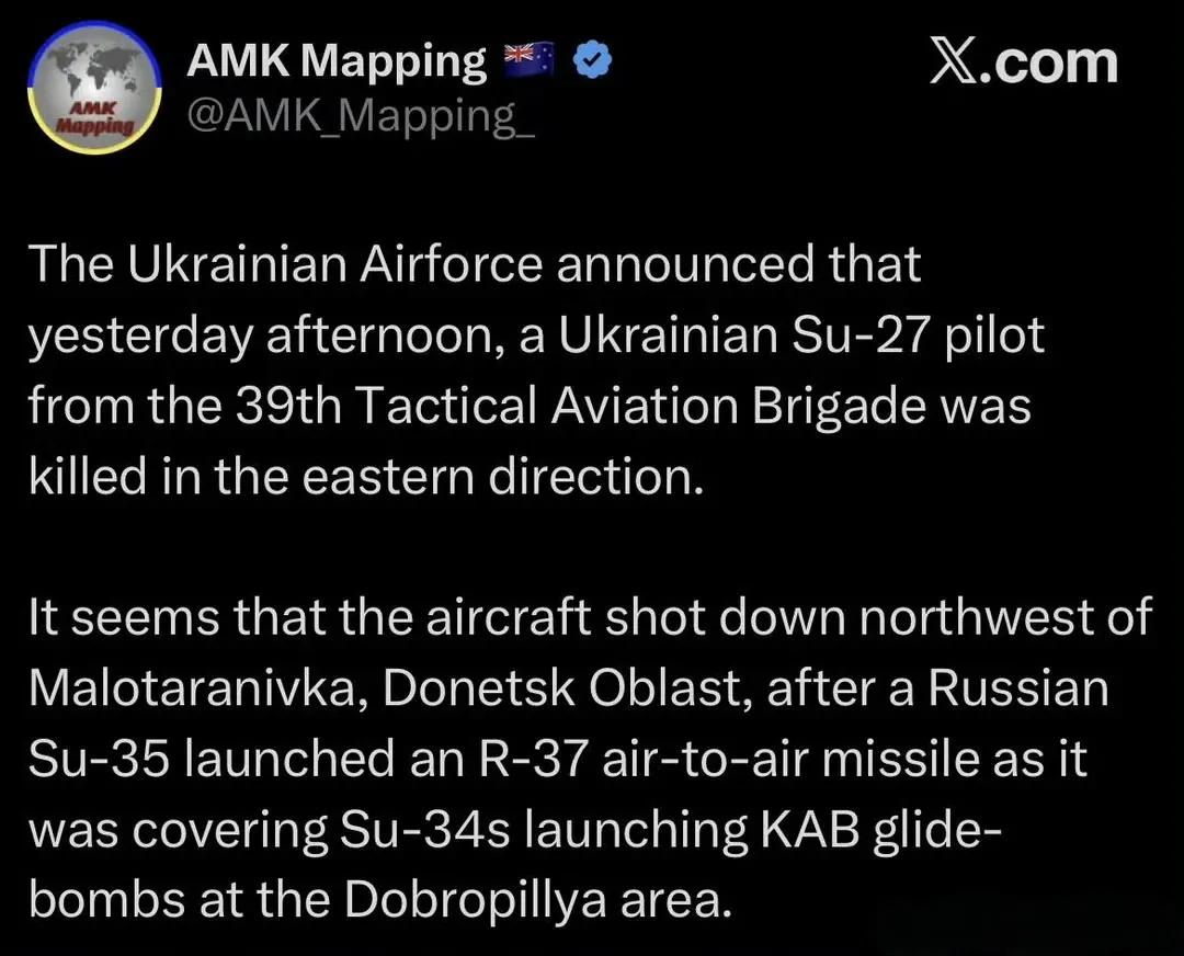又一个!乌克兰空军的精英飞行员就这么没了,连弹射的机会都没有。一枚导弹从天边飞来,一切就都结束了。这仗,对乌克兰来说,到底还怎么打下去?   12月8日,俄军一架苏-35S战斗机正在为执行轰炸任务的苏-34战斗轰炸机护航。突然,它锁定了一架乌克兰空军的苏-27S战斗机。   下一秒,一枚R-37M远程空空导弹脱离挂架,呼啸而去。   乌克兰空军第39战术航空旅的伊万诺夫中校甚至来不及做出任何反应,就在高空被直接“点名”,当场阵亡。   有人可能觉得这只是一次普通的战损,但在懂行的人眼里,这简直是压垮骆驼的又一根稻草。   稍微翻翻近两年的战报就会发现,这已经成了乌克兰空军挥之不去的日常噩梦。   就在今年2月3日,乌克兰空军第831战术航空旅的苏-27S飞行员伊万·博洛托夫。   也是在类似的情况下被俄军苏-30SM2战机在130公里外发射的导弹击落,同样是人机俱毁。   时间再往前推,2024年7月29日,一架俄军苏-35S更是创下了惊人的213公里击落纪录,对手是一架乌克兰的米格-29。   同年5月17日,第831旅的参谋长瓦西柳克中校驾驶苏-27,直接被R-37M凌空打爆。   一个极其残酷的事实是,凡是被这种导弹盯上的乌克兰飞行员,几乎没有生还的记录。   这已经不是简单的装备差距,而是一种近乎降维打击的屠杀。   这枚让乌克兰飞行员闻风丧胆的导弹,就是R-37M。   说起来,它的前身R-37是专门为米格-31截击机开发的“长矛”,用来在大后方猎杀敌方的预警机和加油机。   谁能想到,经过现代化改造后的R-37M,如今成了俄军苏-35S、苏-30SM2甚至苏-57这些主力战机最爱用的“杀手锏”。   这玩意儿全重超过500公斤,战斗部就足足有60公斤,简直是个空中炸药包。   更要命的是它的性能。最大射程超过300公里,飞行速度高达6马赫。   这是什么概念?意味着当乌克兰战机的雷达告警器刚刚响起时,导弹可能已经飞到了眼前,根本不给你反应和规避的时间。   它的制导方式也相当无赖,采用了复合制导。   先靠惯性制导飞向目标大致区域,等离得差不多了,再打开自己的主动雷达锁定目标。   这种“打了就跑”的模式,让发射导弹的俄军战机自身风险也降到了最低。   当然,光有“神兵利器”还不够,俄军现在玩的是一套组合拳。   他们凭借着相对完善的空战体系,比如A-50U预警机、地面远程雷达和战机之间的数据链,能在高空远远地就发现乌军战机。   而乌克兰空军的处境就尴尬多了。为了躲避地面防空火力,他们的战机大多时候只能在超低空活动,视野受限。   再加上缺乏预警机支援,机载雷达和告警系统又相对老旧,在俄军面前几乎是“单向透明”的。   俄军飞行员在高空,一边喝着咖啡一边就把几百公里外的对手给锁定了。   而乌克兰飞行员则像是在黑暗森林里摸索,不知道什么时候就会从哪个方向飞来致命一击。   这种“超视距”打击,正在彻底改写现代空战的规则。   过去电影里那种双方战机互相绕圈、近距离格斗的场景,在如今的战场上已经越来越少见了。胜负在目视接触前早已注定。   这不仅仅是俄乌战场上的事。俄罗斯通过这场冲突,积累了全世界独一份的超远程空空导弹实战经验。   这无疑刺激了其他军事大国,比如中国的霹雳-17和美国正在加紧研发的同类武器。未来空战的远程化趋势,已经不可逆转。   战场上的节节败退,也直接影响着基辅的政治决策。   就在这起空战发生的同时,乌克兰总统泽连斯基罕见地表示,已经准备好举行选举,并请求美欧提供安全保障。   很多人都记得,美国前总统特朗普最近在接受采访时,就曾敦促乌克兰要“接受现实”。   现在看来,战场上的残酷现实,正在让基辅的选项变得越来越少。   说白了,现代战争打的就是体系、是技术代差。   当你的对手能从200公里外对你进行精确“点名”时,单靠飞行员的勇气和牺牲精神,真的很难改写最终的结局。   伊万诺夫中校的阵亡,恐怕不会是最后一个悲剧。   对于仍在苦苦支撑的乌克兰空军而言,这片他们曾经誓死保卫的天空,如今正变得越来越危险和陌生。