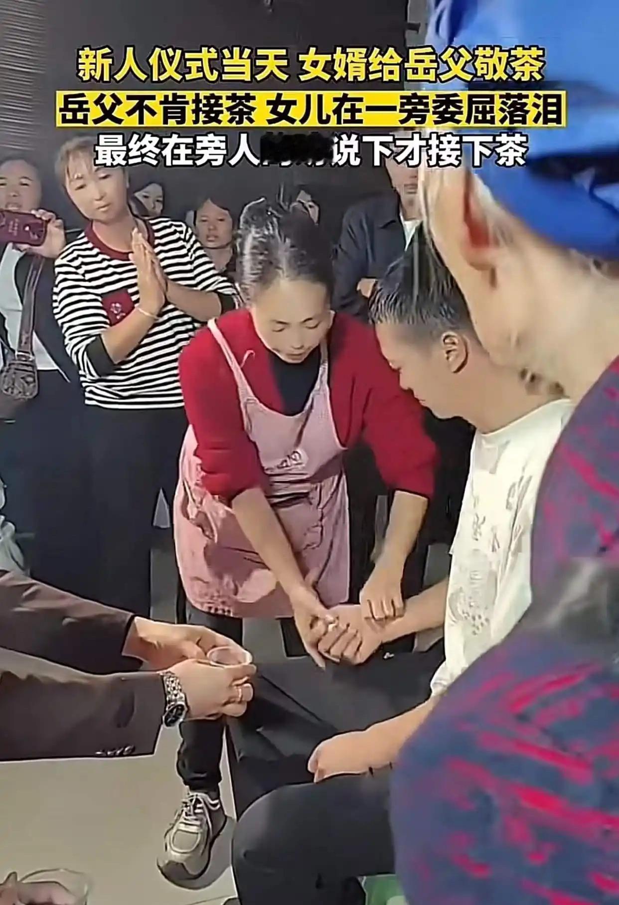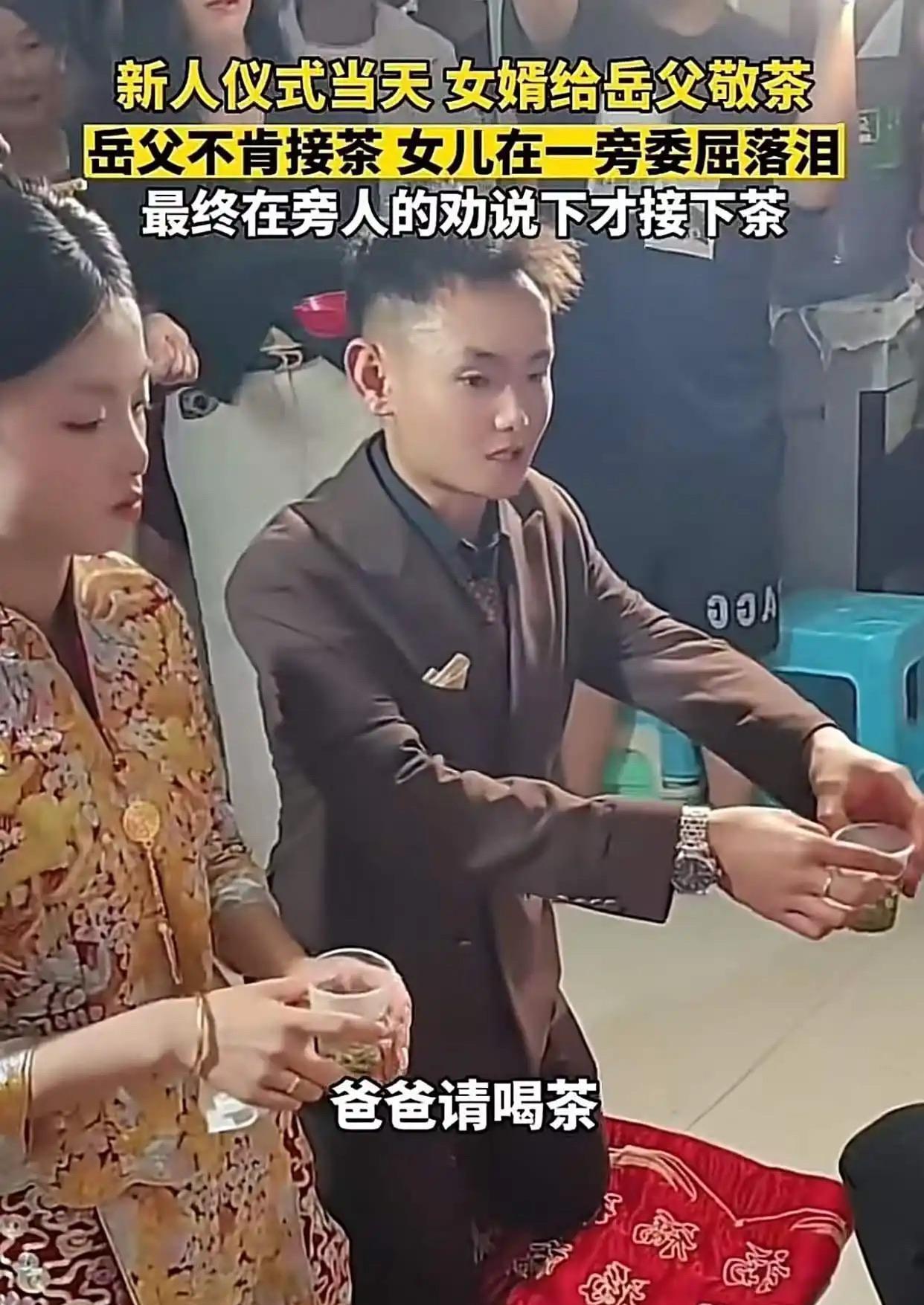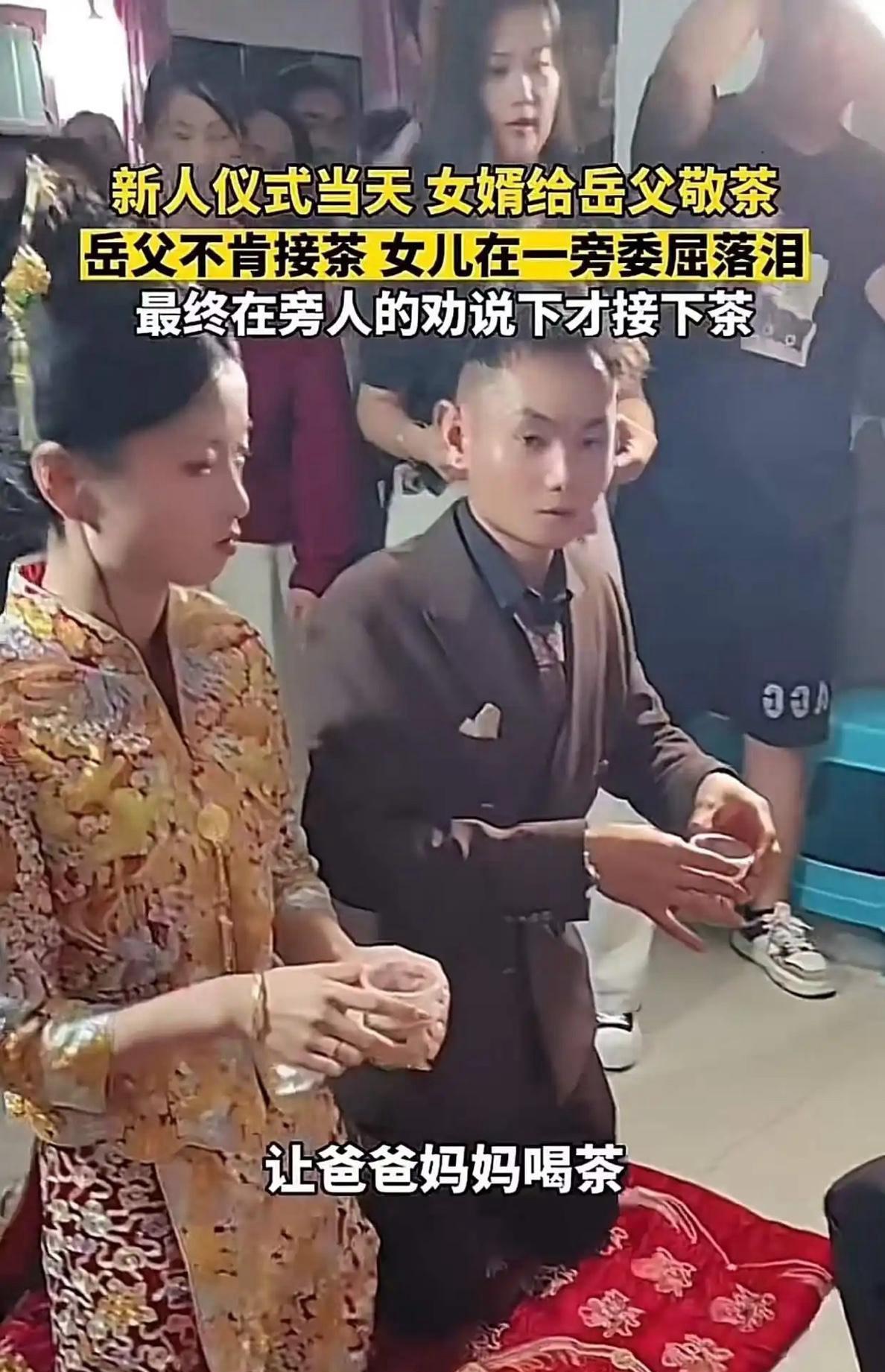 “打谁的脸?”安徽一对新人结婚,女婿给岳父敬茶,岳父迟迟不接,新娘在一旁委屈的落眼泪,最后还是在旁人的强硬下才勉强接了,但岳父红着眼眶始终不看跪在面前的女儿女婿! 农村婚礼的红绸还在梁上飘着,唢呐声刚歇,新郎的西装裤膝盖处已被压出两道深痕。 他双手捧着青瓷茶杯,杯底的牡丹纹被指节攥得发白,“爸爸,请喝茶”的声音在安静的堂屋里荡开,却没等来预期的回应。 岳父坐在太师椅上,蓝布褂子的领口敞着,目光黏在地面的青砖缝里,像在数着什么——或许是女儿从小到大的奖状,或许是女婿家那辆没盖车库的面包车。 新娘的珍珠耳坠晃了晃,泪珠砸在婚纱裙摆上,洇出一小片深色,她想伸手拉父亲的衣角,手指刚抬起又蜷了回去。 “孩子都跪这儿了!”新娘的大娘突然从人群里挤出来,拍了拍岳父的肩膀,把茶杯往他手里塞,“吉时过了对谁好?” 茶杯最终还是被塞进了岳父掌心,可他的头埋得更低了,通红的眼眶像含着两颗没融化的冰粒,始终没抬眼看女儿女婿一眼。 视频传到网上,评论区吵翻了天。有人说“这是父亲最后的倔强”,也有人觉得“太让孩子难堪”——两种声音像两条平行线,谁也说服不了谁。 倒是我想起邻居张叔的事。三年前他女儿小敏要嫁的阿强,也是“条件不好”的——农村来的水电工,家里还有瘫痪的母亲,张叔当时把茶杯摔在桌上:“我女儿嫁过去不是当保姆的!” 可张叔没在婚礼上闹。他偷偷去工地看阿强干活,见他总帮工友扛最重的梯子,收工后先去医院给母亲擦身,再给小敏发消息说“今天学了道新菜,周末做给你吃”。 小敏感冒发烧那晚,阿强骑着电动车赶了二十里路,背着她往医院跑,衬衫后背全是汗碱,守了一夜没合眼。张叔躲在病房外,看着阿强给小敏喂水时小心翼翼的样子,心里的疙瘩慢慢松了。 婚礼那天,张叔主动接过阿强递来的茶,茶杯在手里转了两圈才开口:“我不是嫌你穷,是怕你没本事疼她。现在我放心了,以后有事找我。” 现在小两口开了家五金店,张叔每天早上七点就去开门,坐在门口的小马扎上,见人就夸阿强:“我这女婿,比儿子还知道疼人。” 回头再看安徽这场婚礼,岳父心里的“坎”其实不难懂——他怕女儿“下嫁”后受委屈,可“怕”不是让女儿在几十号亲友面前掉眼泪的理由。 真正的“把关”,该像张叔那样,婚前睁大眼睛看人品:看他怎么对父母,怎么对陌生人,怎么在下雨天把伞往你女儿那边斜;而不是婚后在婚礼上“卡关”,用面子当尺子,量着女婿的钱包厚度。 有网友说“父亲是极端抗议”,这话站不住脚。既然户口本都给了,红本本也领了,何必在人生最重要的仪式上添堵?婚礼是女儿一辈子的相册封面,非要用尴尬当背景图吗? 更别说,这一闹,女婿心里能没刺?以后小两口吵架,他会不会突然冒出一句:“你爸当初就没瞧得起我!”那根刺扎进婚姻里,拔出来是血,不拔是疼。 说到底,父母对子女的婚姻,该是“摆渡人”撑着船送他们过河,而不是“拦路虎”站在桥头数石子。石子数得再清,河对岸的风景,终究要他们自己走过去看。 就像张叔现在总说的:“孩子的日子是过给自己的,不是过给街坊邻居看的。” 那杯被勉强接过的茶,凉的何止是温度?