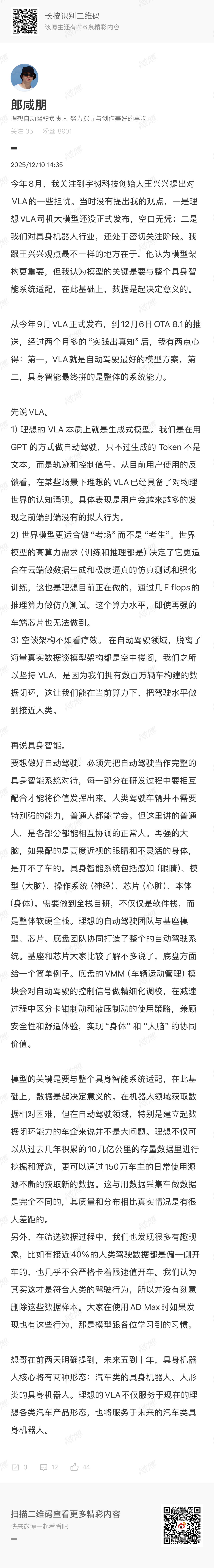 理想副总裁回应王兴兴质疑 理想汽车自动驾驶研发高级副总裁在微博就近期行业关注的“VLA技术路线争议”及理想在VLA与具身智能领域的布局进展进行公开回应。原文如下配图。