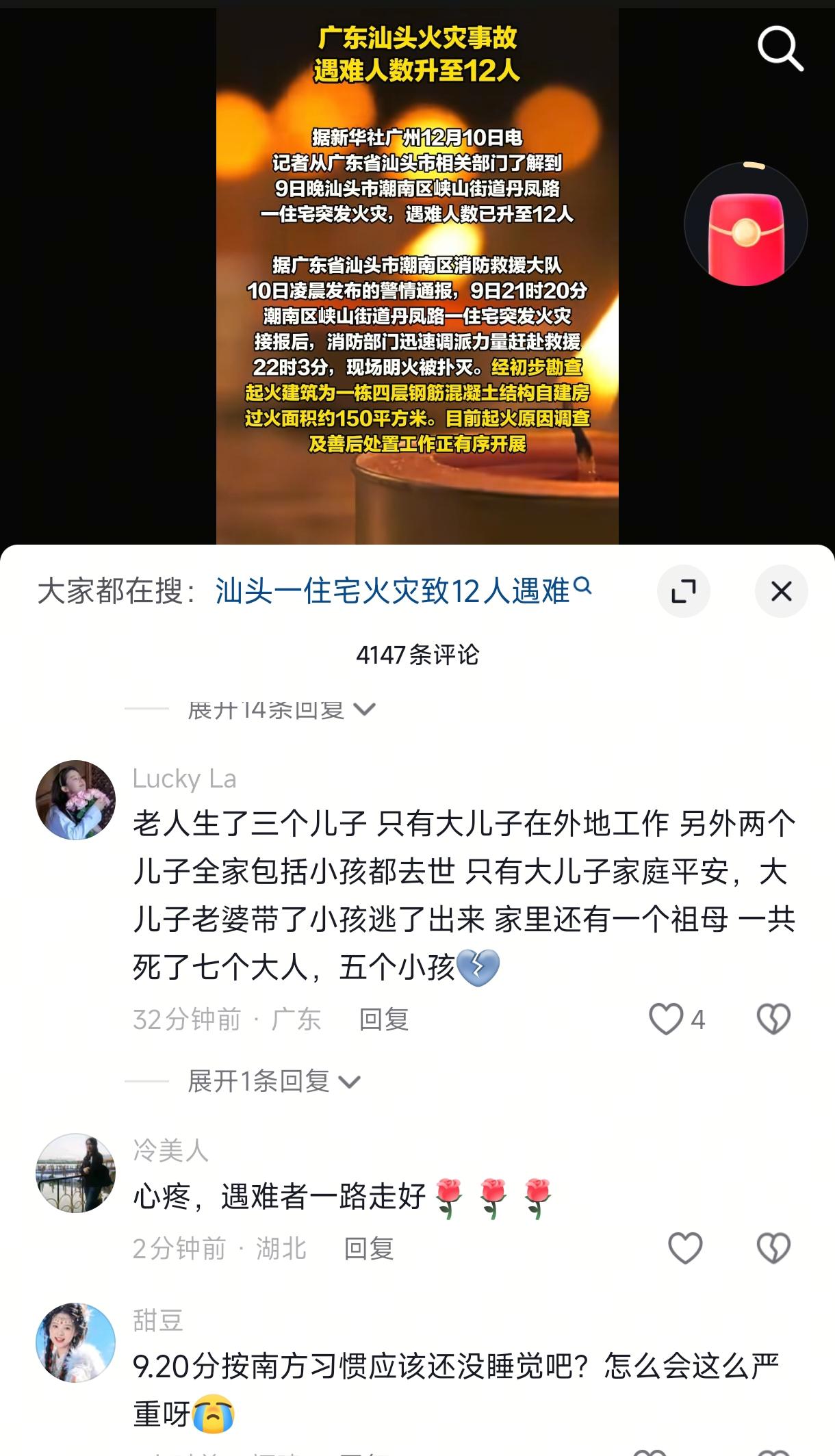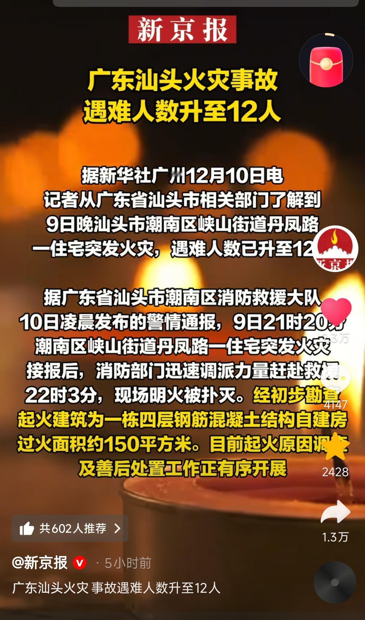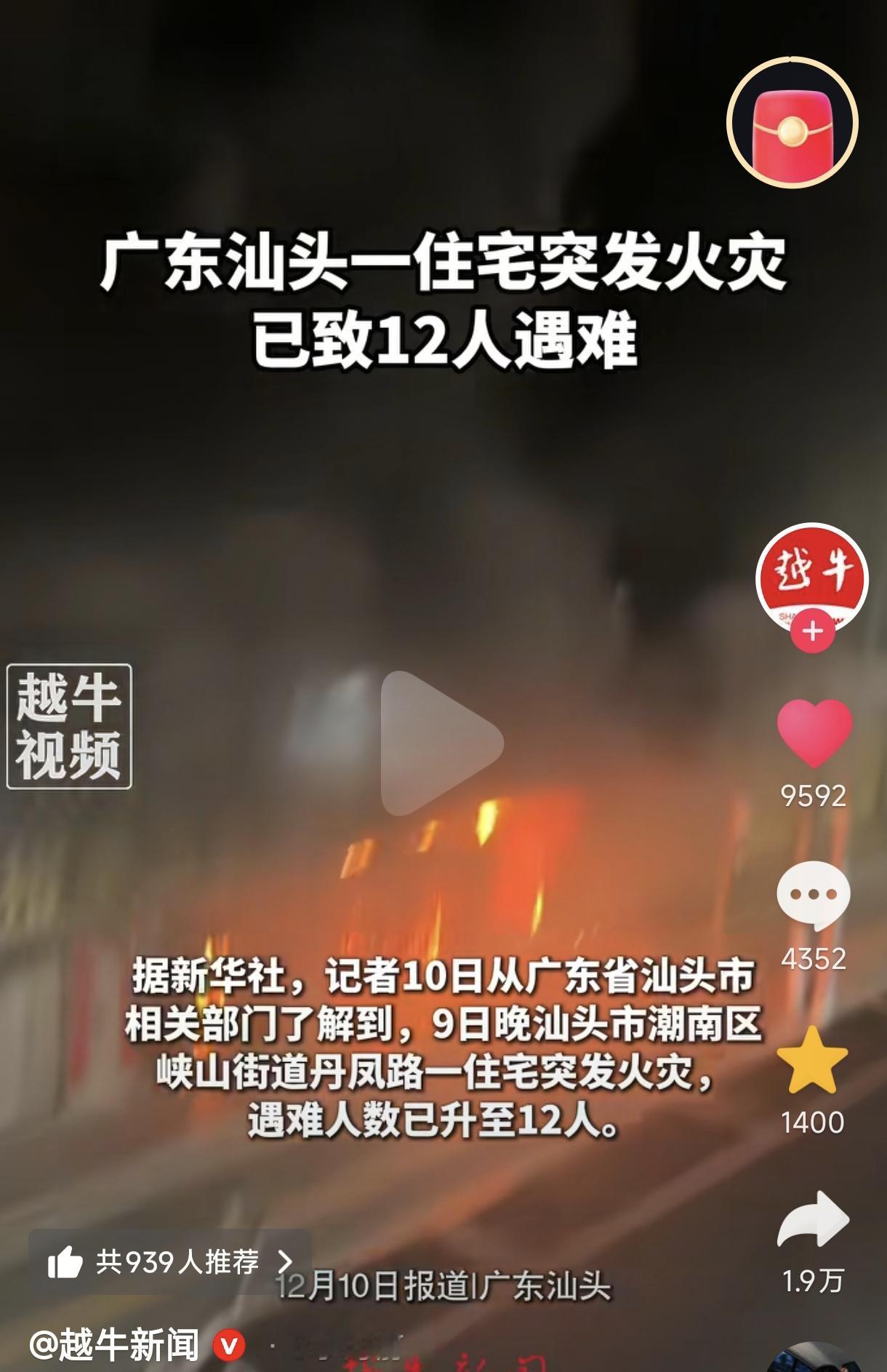 太惨了!一家四代同堂12口人包括奶奶、父母、儿子及其孩子全部死于大火之中! 万幸的是:大儿媳与其四个儿女逃生成功! 12月9日晚上21时20分,广东汕头一四层楼的自建钢筋混凝土住宅突发大火,起火点是一楼经营五金机电的三间铺面,明火就是从里窜出来然后迅速蹿至二三四楼(过火面积150平米),而当时楼上就住着七个大人、五个小孩。 之后消防部门赶到救援灭火至22点03分,但不幸的是已有8人死于大火,其余4人送医救治却抢救无效死亡,一个晚上就遇难了一家四代12口人,真是太惨痛了! 据网上综合信息称,这是一个20口人的大家庭,死的是一个祖母、爷爷奶奶、二儿子夫妻及四个小孩、三儿子夫妻及一个孩子,共计12人。 大儿子在东莞上班,大儿媳给两个女儿带口罩跟湿毛巾叫她们跑出去,她自己则一个胳膊夹一个带着两个儿子跑出去,也就是说这一大家子20口人只有大儿子一家六口得以幸免于难。 网上还称这一家几兄弟在当地口碑极好,人品极佳,做生意都十分诚信,家人也都很勤劳善良,没想到这么好的人家却没得到老天的眷顾,好人却没好报,老天真是不长眼啊。 有网友质疑晚上9点多一般都还没睡,为什么没有逃生出去啊?我推测一是火势烧起来太猛了,根本来不及反应;二是估计四面都安了防盗窗,火烧起来也没地方逃。 其实,像这种商住一体“下店上住”的楼层真不适于住家,但我感觉很多乡镇都这样,我老家也是这样的,最底一层用开商铺,楼上拿来住家,但是隐患真的太大了。 像此案例中,吴家一楼五金店中的电气配件、包装材料等很可能是可燃物品,又可能与楼上的居住区没做实体分隔,一楼一旦起火火势与有毒烟气就会快速蔓延。 还有,就是装了全封闭式的防盗窗,虽有电梯但只有一部,这无异于直接阻断了逃生与救援的通道,加之发生在夜间,居住者多为老人妇孺等逃生能力弱的人,最终酿成四代同堂12名亲人遇难的人间大惨剧。 最幸运的莫过于大儿子一家,大儿媳更是女中豪杰,凭一己之力挽救了四个孩子,等于再次给了孩子们一次生命,真的太了不起了! 愿:逝者安息,生者警醒!秋冬干燥,年关将至,请大家一定注意防火防盗,保护好财产与生命的安全,以避免发生悲剧。 (来源:新京报、齐鲁晚报、超牛视频等)