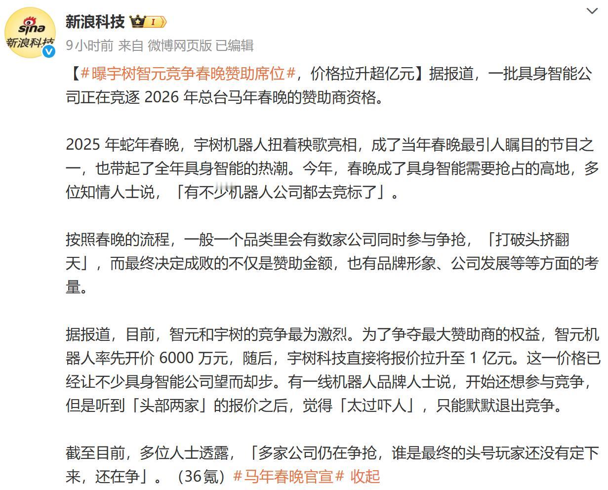春晚广告竞争,这种情况似乎最近几年没怎么听说过了。 十几年前甚至二三十年前的时候,春晚的收视率极其火爆,可以说是全国人民的节日。不过最近几年看春晚的人越来越少了,关于春晚广告的竞争,也鲜见诸报端了。 但是去年宇树机器人上了春晚后,火遍了大江南北,所有头部的机器人公司都很眼馋! 作为智能机器人领域的两个头部玩家,自然都不会放过这么好的机会,看看谁能笑到最后吧。