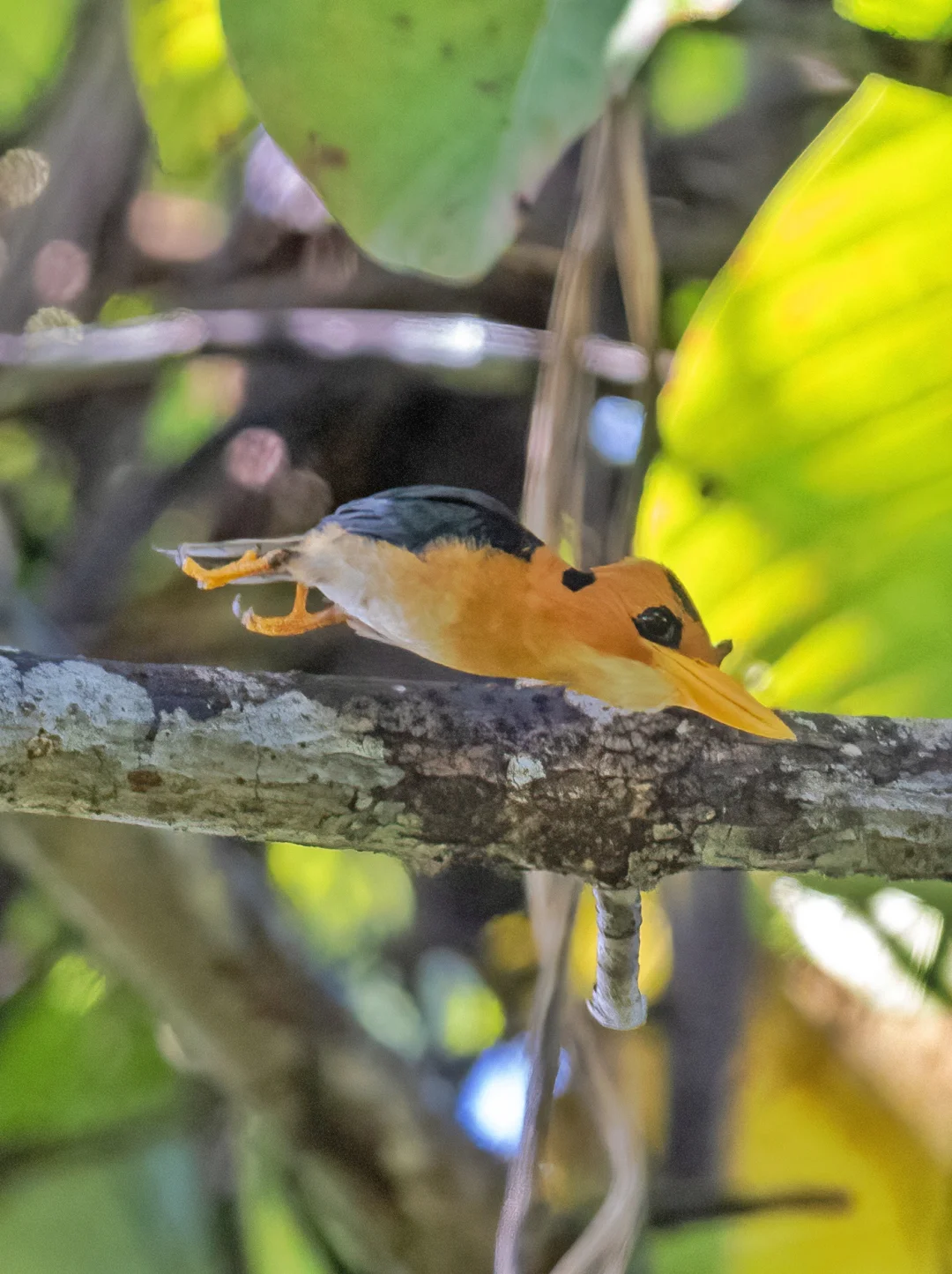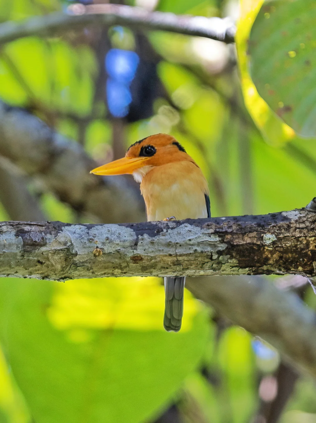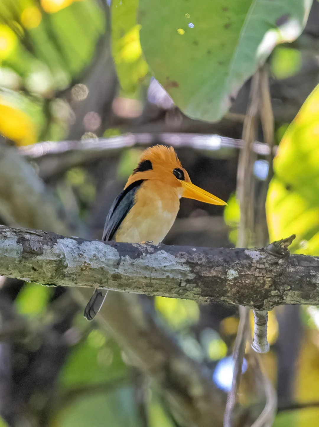 原创拍摄于2024.09 黄嘴翡翠,佛法僧目翠鸟科黄嘴翡翠属。 黄嘴翡翠是中型翠鸟,分布在新几内亚和澳东北。它们不像别的翠鸟和翡翠蓝闪闪,它们最显著的特征是橙色头部、亮黄色的喙,眼周黑色面积大让人感觉黑色的眼睛大又圆,萌萌哒。背部蓝绿色,尾部蓝紫色。雌鸟冠部有黑色斑块。 这只黄嘴翡翠找了好久好久,就是一看见就飞走,不停的,太难了。还好后来停下来了一会会,匆匆拍几张,真是可爱。