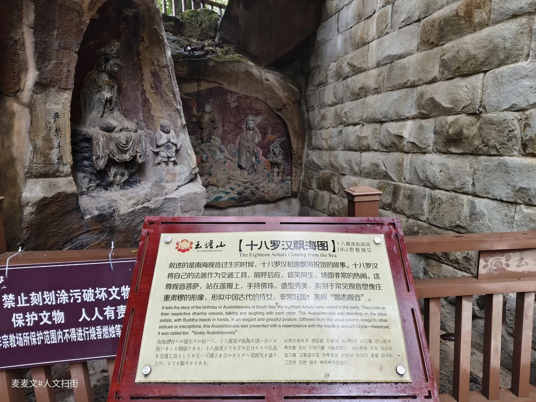 玉蟾山摩崖造像,位于四川省泸州市泸县县城东南一公里的玉蟾山上,是第七批全国重点文物保护单位。 造像始凿于唐代,盛于明代永乐至天启年间,少数为清代作品,现存414尊。以佛教题材为主,风格多样,线条流畅,神态逼真。千手观音高5.6米,11头36手,身后千手如孔雀开屏,为标志性作品。九龙浴太子图采用镂空雕与高浮雕结合,展现释迦牟尼诞生场景。还有悟道图,人性化构图,表现禅意。十八罗汉飘海图动态场景,生动传神等精品。