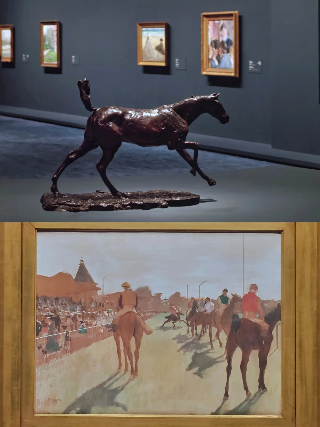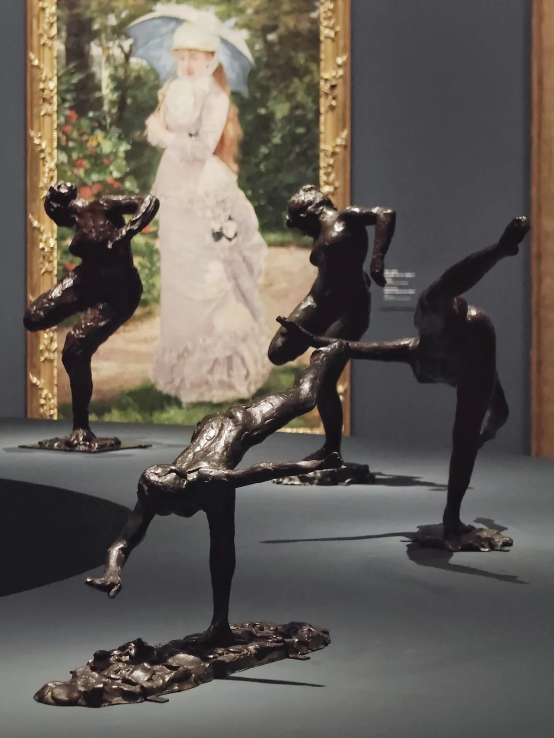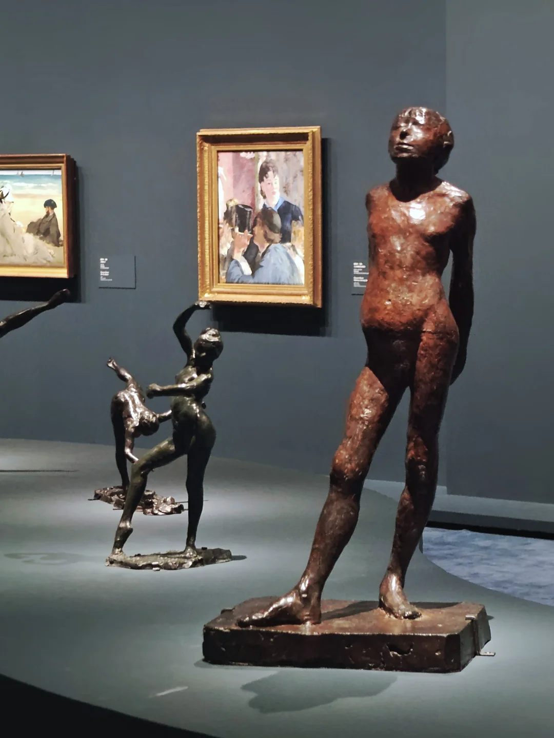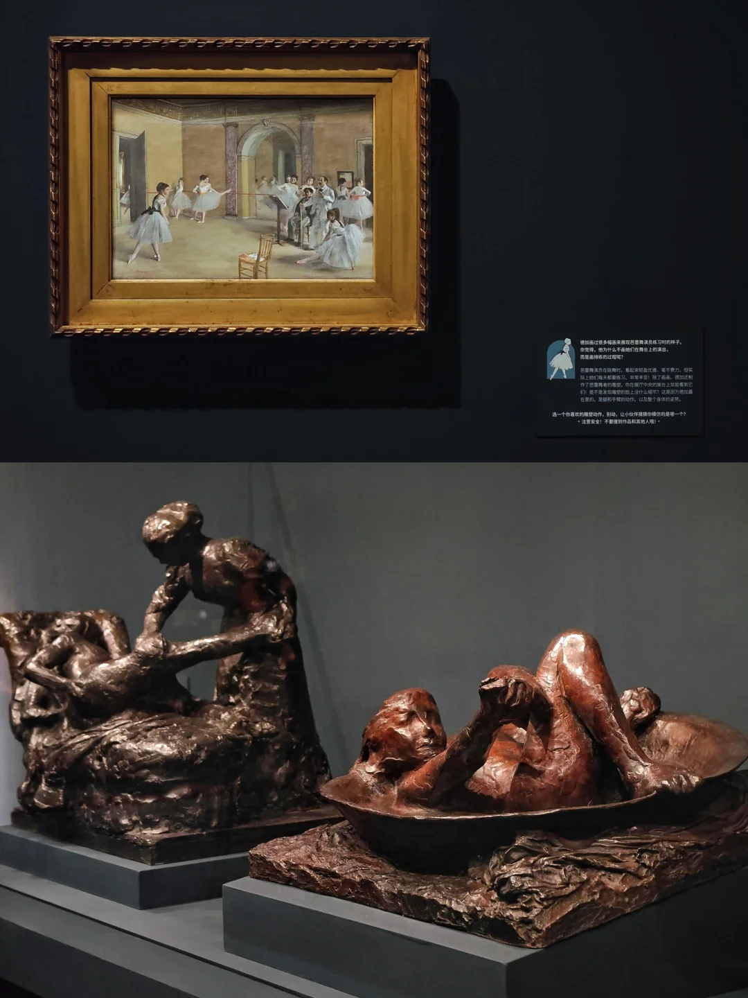 本篇为第4篇,进入到蕞受关注的第三部分\u200c「印象派与新绘画」\n\t\n👀策展人的视角在这一章体现得很明确,展览不是线性呈现印象派及其对现代生活的直接描绘,而是以对比、关联的方式来展现艺术风格递进演化多元并行、交错发展的复杂性。\n🎨本单元的开头将德加和马奈并置,他们均与印象派关系密切,但又都明确表示过自己并非印象派一员。马奈被追认为\"印象派鼻祖\",而德加则成为连接古典与印象派的关键人物\u200c,他们共同推动了现代绘画的发展。\n两位艺术家都对如何捕捉“运动”有着强烈的执念。他们不满足于静态再现,而是试图通过绘画让时间流动、让事物处于变动之中。\n\t\n🖼佩列蒂埃街歌剧院的舞蹈教室\n👨\u200d🎨Edgar Hilaire Germain de Gas\n德加出生于巴黎富裕家庭,早年学习法律后转攻艺术,师从安格尔弟子路易·拉莫特,和许多学院派出身的艺术家一样相当重视素描与构图。他是个深度“宅男”,完全拒绝户外写生,只钟情于都市室内空间。他发展出了独特技法,如粉彩混合媒介、人工光源处理、日本浮世绘式裁剪构图等。\n后台和排练室中的芭蕾舞伶是德加蕞钟爱也蕞擅长的绘画题材,他从不画名角,模特都是无名的底层舞者。这幅尺幅不大的画展现了芭蕾舞者们接受考核的场景,身着白衣的巴黎歌剧院导师Louis François Mérante坐阵,其他舞者观察着当前被考核的舞者。作品通过群体与个体的对立关系构建画面,构图严谨,而前景那把空置的椅子是极具张力的视觉焦点。德加通过自创的亮色腰带与黑丝带点缀当时的芭蕾服装,与红色练习把杆共同构成了独特的装饰美学。\n\t\n🗿14岁的小舞女的luo体研究\n👨\u200d🎨Edgar Hilaire Germain de Gas\n德加在30岁前主要画油画,35岁后慢慢转向色粉画,晚年视力衰退后又投身于雕塑。\n展区中心的S型展柜上一组大小不一姿态各异的舞者青铜像,这是德加去世后在其工作室发现的上百件蜡像的青铜翻铸中的部分作品。侧边展柜中也有几件其他题材的,不过也全都是肢体动感突出的女性形象。\nC位这尊青铜像可以看作是德加生前唯一展出过的雕塑《14岁的小舞女》的雏形(原作是蜡像)。\n雕塑中除了芭蕾舞者,还可以看到他热衷的另一个题材——赛马的身影。\n\t\n⚠️字数限制,剩余见评论区\n\t\n