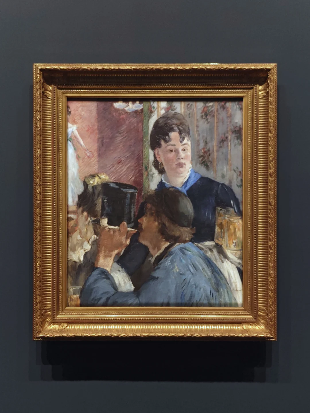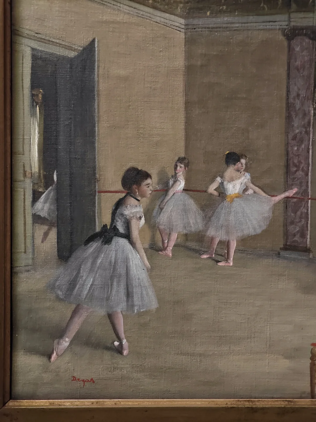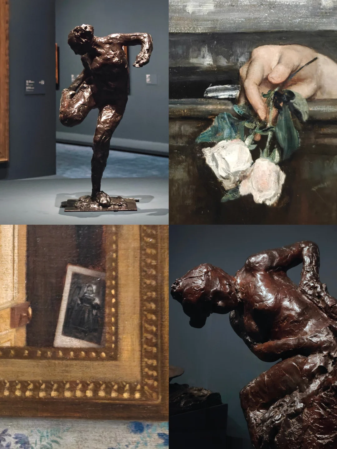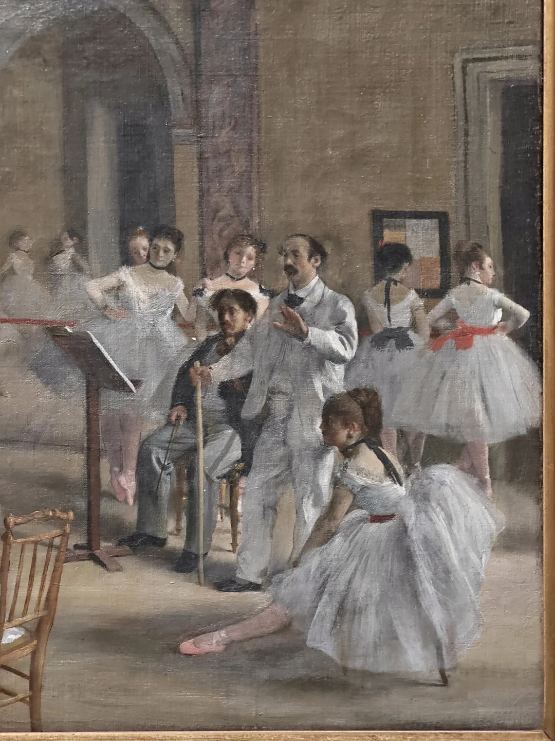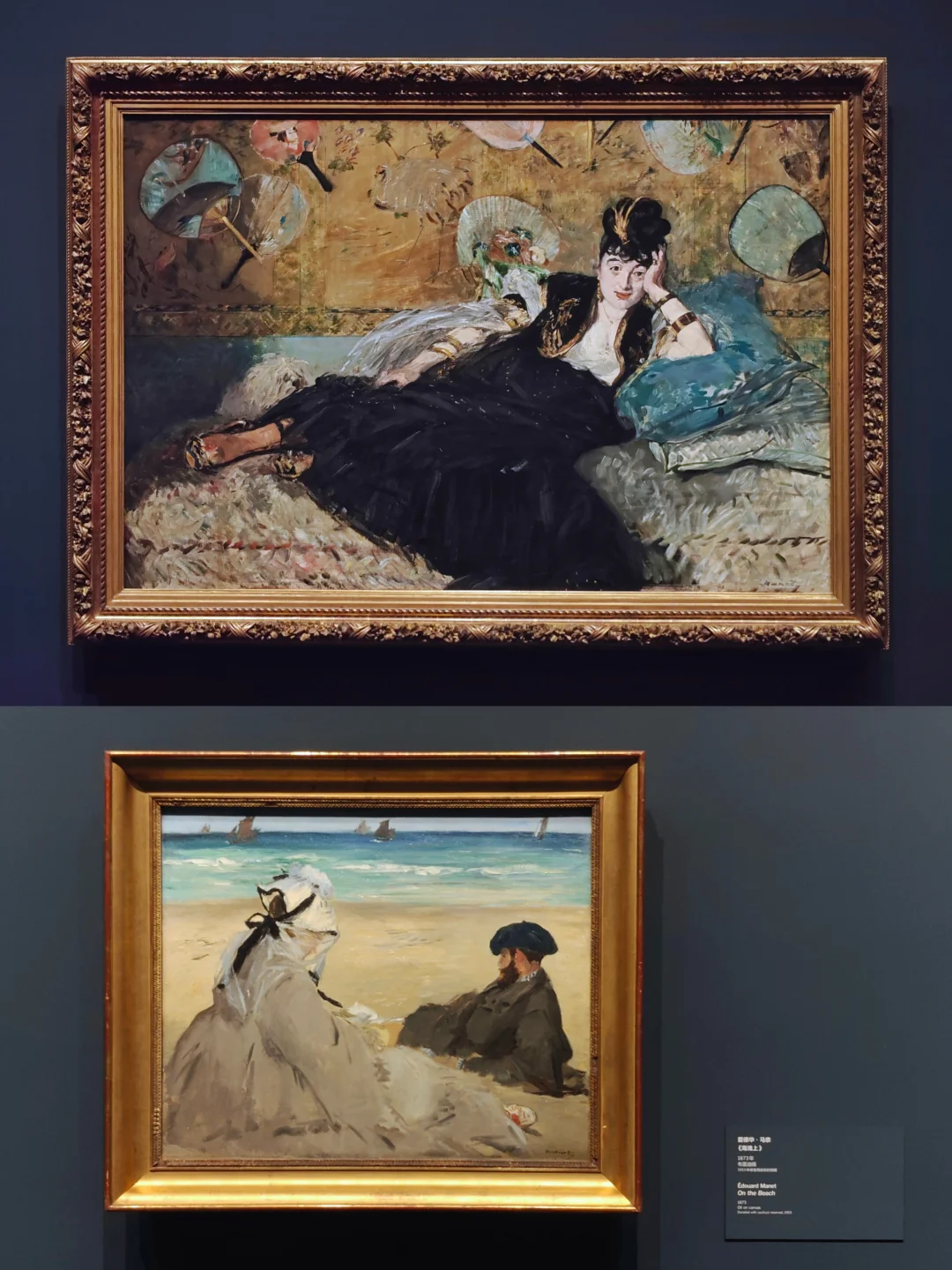 本篇为第4篇,进入到蕞受关注的第三部分\u200c「印象派与新绘画」\n\t\n👀策展人的视角在这一章体现得很明确,展览不是线性呈现印象派及其对现代生活的直接描绘,而是以对比、关联的方式来展现艺术风格递进演化多元并行、交错发展的复杂性。\n🎨本单元的开头将德加和马奈并置,他们均与印象派关系密切,但又都明确表示过自己并非印象派一员。马奈被追认为\"印象派鼻祖\",而德加则成为连接古典与印象派的关键人物\u200c,他们共同推动了现代绘画的发展。\n两位艺术家都对如何捕捉“运动”有着强烈的执念。他们不满足于静态再现,而是试图通过绘画让时间流动、让事物处于变动之中。\n\t\n🖼佩列蒂埃街歌剧院的舞蹈教室\n👨\u200d🎨Edgar Hilaire Germain de Gas\n德加出生于巴黎富裕家庭,早年学习法律后转攻艺术,师从安格尔弟子路易·拉莫特,和许多学院派出身的艺术家一样相当重视素描与构图。他是个深度“宅男”,完全拒绝户外写生,只钟情于都市室内空间。他发展出了独特技法,如粉彩混合媒介、人工光源处理、日本浮世绘式裁剪构图等。\n后台和排练室中的芭蕾舞伶是德加蕞钟爱也蕞擅长的绘画题材,他从不画名角,模特都是无名的底层舞者。这幅尺幅不大的画展现了芭蕾舞者们接受考核的场景,身着白衣的巴黎歌剧院导师Louis François Mérante坐阵,其他舞者观察着当前被考核的舞者。作品通过群体与个体的对立关系构建画面,构图严谨,而前景那把空置的椅子是极具张力的视觉焦点。德加通过自创的亮色腰带与黑丝带点缀当时的芭蕾服装,与红色练习把杆共同构成了独特的装饰美学。\n\t\n🗿14岁的小舞女的luo体研究\n👨\u200d🎨Edgar Hilaire Germain de Gas\n德加在30岁前主要画油画,35岁后慢慢转向色粉画,晚年视力衰退后又投身于雕塑。\n展区中心的S型展柜上一组大小不一姿态各异的舞者青铜像,这是德加去世后在其工作室发现的上百件蜡像的青铜翻铸中的部分作品。侧边展柜中也有几件其他题材的,不过也全都是肢体动感突出的女性形象。\nC位这尊青铜像可以看作是德加生前唯一展出过的雕塑《14岁的小舞女》的雏形(原作是蜡像)。\n雕塑中除了芭蕾舞者,还可以看到他热衷的另一个题材——赛马的身影。\n\t\n⚠️字数限制,剩余见评论区\n\t\n