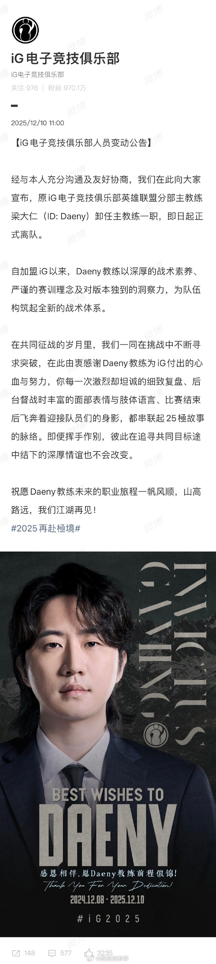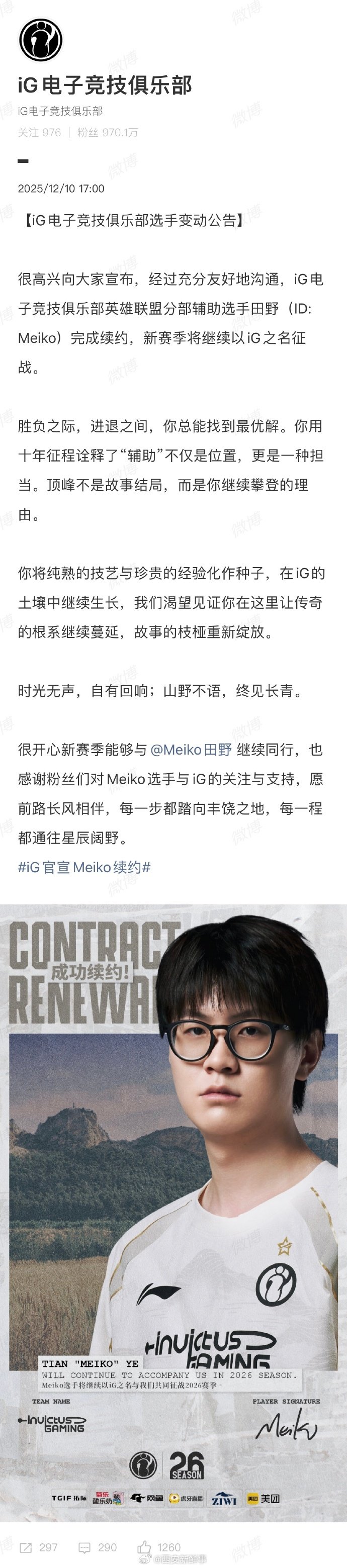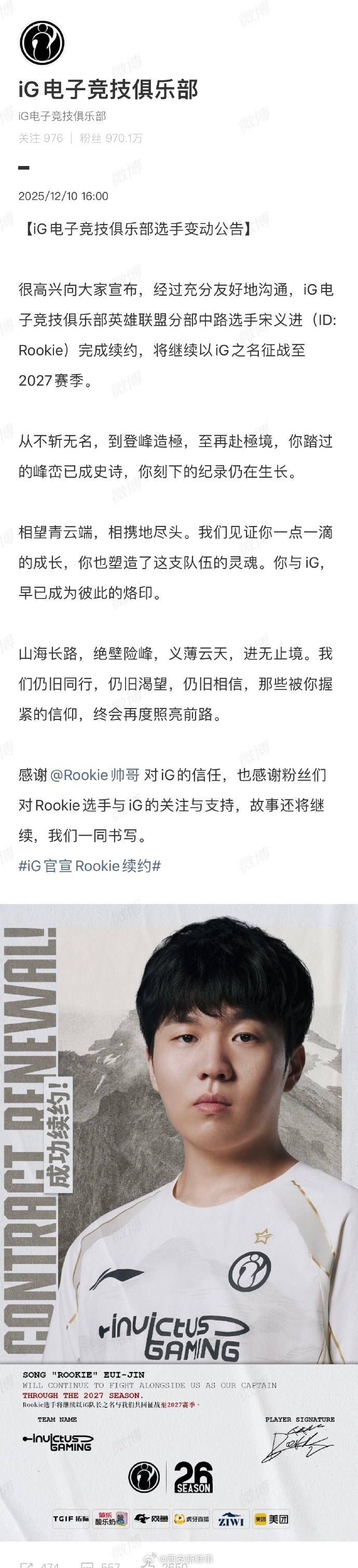 【iG多位选手续约】iG官宣多位选手续约12月10日,发文官宣包括Wei、Meiko、Rookie等在内的多位选手续约。但主教练Daeny已卸任,并宣布加入BLG,相关人员变动引起关注。iG官宣Rookie续约